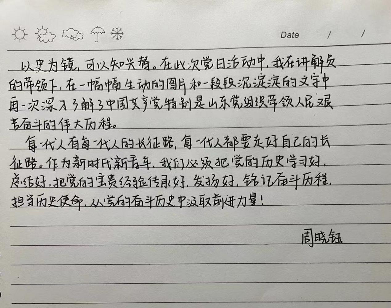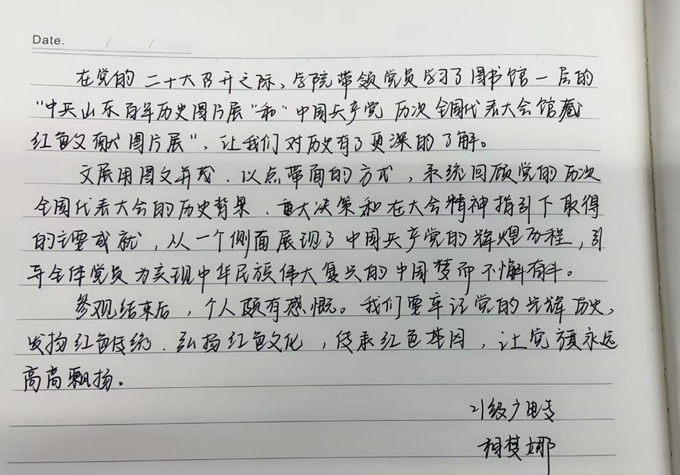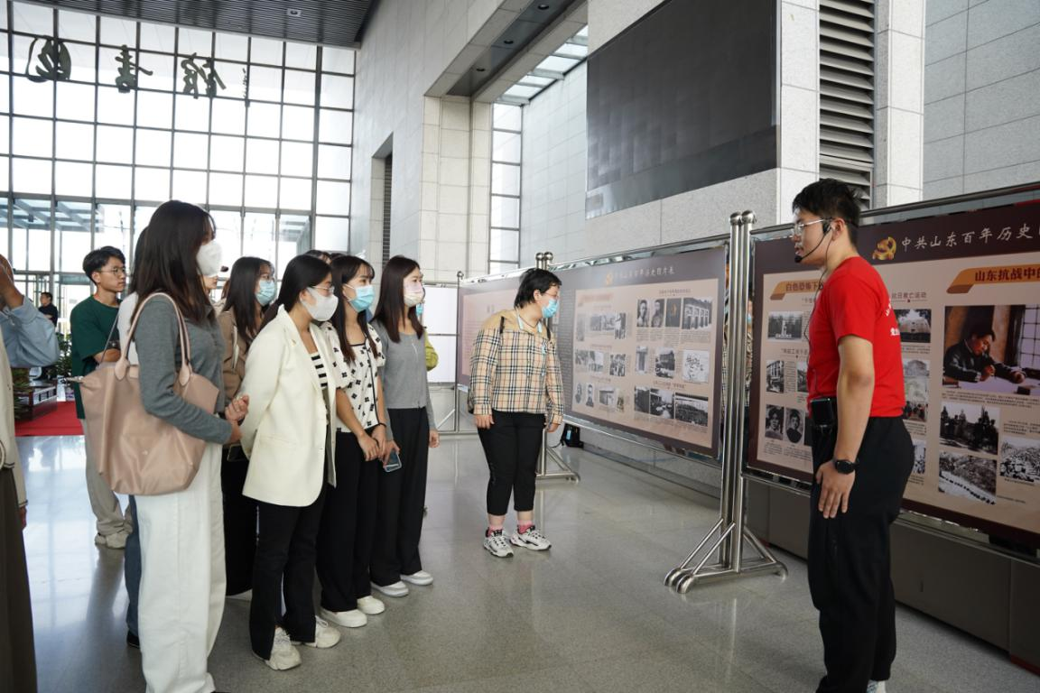 怀着澎湃的心情,同学们又参观了“中共山东百年历史图片展”。该图片展精选300余幅图片,全面展示在党中央坚强领导下,山东党组织在各个时期带领山东人民奋勇前进的巨大成就。随着讲解员的步伐,参观人员认真了解学习了山东走过的百年辉煌历程,深刻领会了中国共产党领导中国人民站起来、富起来、强起来的艰辛探索和历史必然。观展结束后,同学们纷纷表示这是一场有意义、有收获的历史文化洗礼,书写提交了个人感悟。