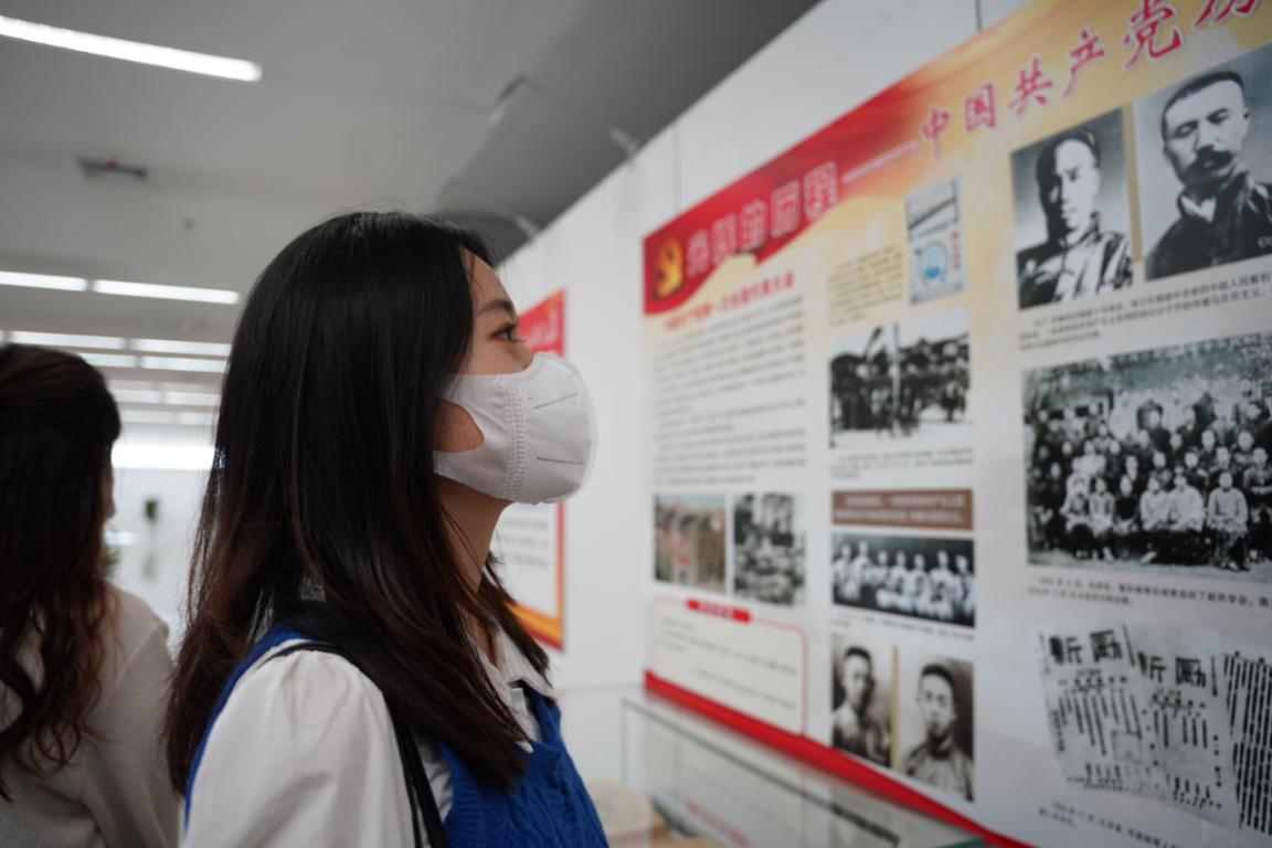 活动伊始,党员们首先参观了“喜迎二十大,奋进新征程”中国共产党历次代表大会馆藏红色文献图文展。该展览以中国共产党带领全国各族人民进行革命、建设和改革的奋斗历程为背景,着眼从中共一大到十九大的重要场景,点面结合地带领参观者回顾了党史的发展脉络,重温了党的光辉历程,同时也展望了未来新的伟大征程。特别是讲解员对于党报党刊的讲解,更是燃起了新传学子的理想信念。