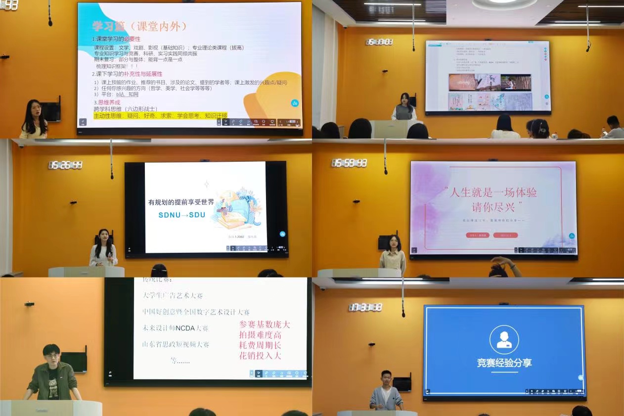 会上,六位同学分别对自己的保研与竞赛经历进行分享。李苇航将大学划分为扎根、生长、结果三个阶段,鼓励同学们认真学习专业知识,积极参加相关比赛,以良好的心态投身学习与生活之中。郑历惠以自己的保研经历为切入点,对保研的具体流程作详细介绍,分享了自己在面试方面的心得体会。陈涟漪以“人生就是一场体验,请你尽兴”为主题,从日常学习、实习经历和保研经历三个方面出发,强调了日常学习和实践经验对保研的重要性。刘璇从学习和科研竞赛两方面作分享,鼓励大家扎实学习、大胆尝试,在日积月累中增长见识、增长本领。何铭轩对影评比赛和大创项目进行详细介绍,使同学们打破信息差,进一步明确了自身努力方向。张岩从自身经历出发,向大家详细介绍了各类大学生艺术设计大赛,提醒同学们重视比赛、积极参赛。