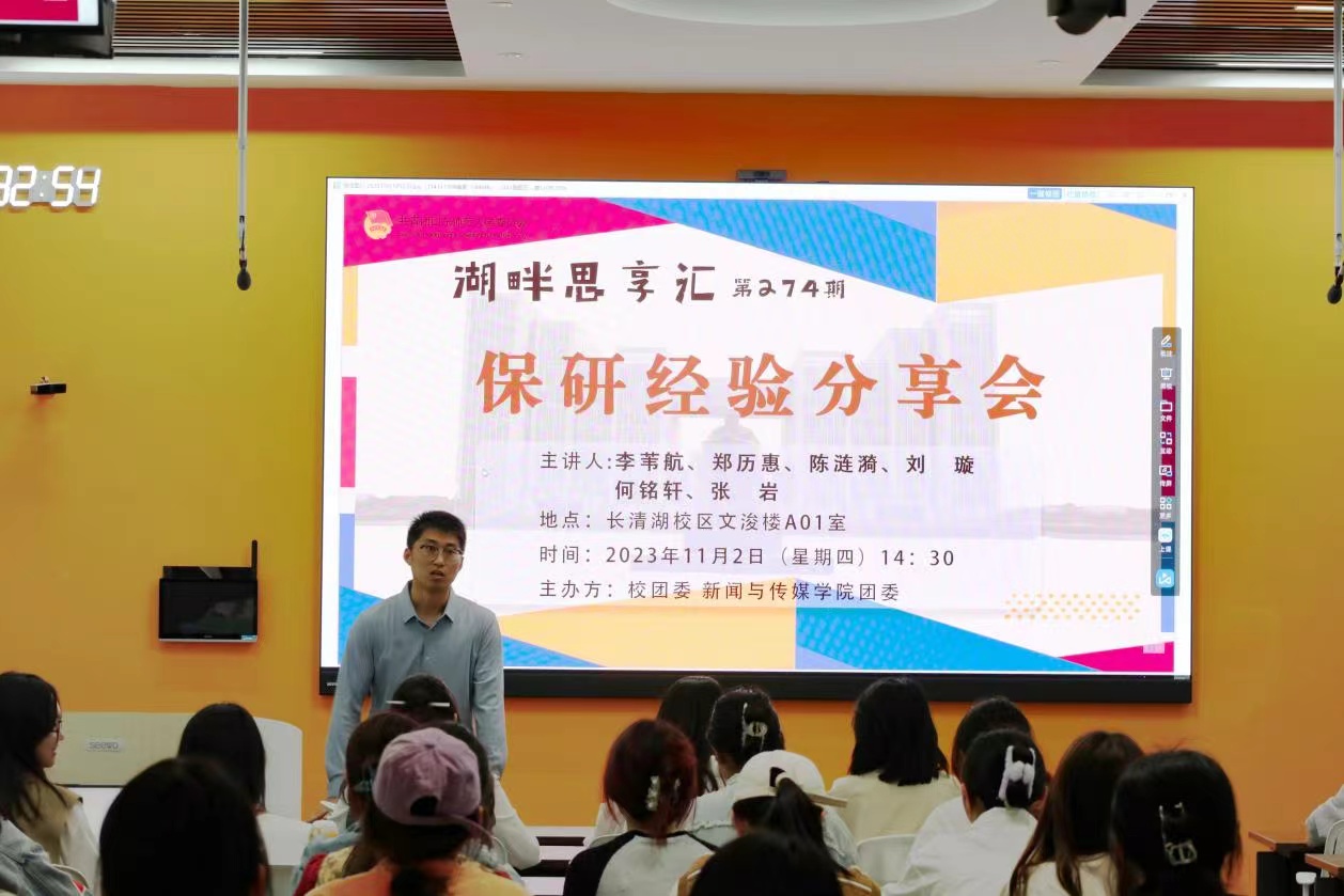 11月2日下午,校团委、学院团委于长清湖校区文浚楼A01室举办湖畔思享汇系列活动第274期——保研经验分享会。本次讲座邀请2020级保研优秀学生李苇航、郑历惠、陈涟漪、刘璇、何铭轩、张岩分享保研经验,约90名本科同学聆听本次会议。会议由2021级辅导员陈军晓主持。