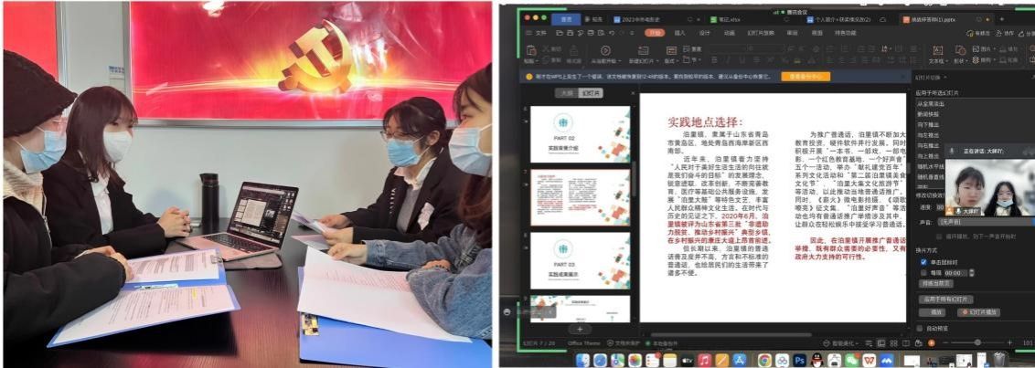 参加本次“挑战杯”学术科技竞赛的团队共14个,为更好地增强竞赛作品质量,各项目团队负责人积极组织团队成员就项目选题、作品策划和后期实施进行交流讨论。讨论期间小组成员各抒己见,畅所欲言,思维的磨合打造出了组内最终选题。其中,负责人张雅萱团队,实施线下线上双结合的讨论方式,并参考前期实地考察的有关推广普通话助力乡村振兴等数据,更好地表达和记录成员想法和团队进展。