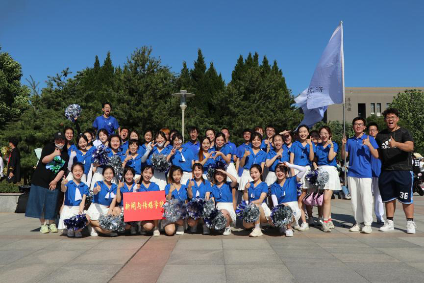 健美操大赛分为开幕式与正式比赛两部分。伴着激昂的背景音乐,开幕式在全校各学院健美操成员的出场中拉开帷幕。学院方队身着青春靓丽的“新传蓝”T恤、白色裙装,手握亮银色与蓝色花球惊艳亮相,表演了健美操曲目《一起向未来》,以优美灵动的舞姿充分展现了学院积极活跃的拼搏精神与乐观向上的昂扬姿态。比赛正式开始后,由2020级戏剧影视文学专业张力文、王馨铭,2020级广播电视编导专业苏晓艺、奥妙,2020级数字媒体专业罗欣怡,2021级新闻学专业张树岳,2021级网络与新媒体专业诸葛文馨,2021级戏剧影视文学专业王伟奕、刘珊组成的学院健美操代表队以《darling》和《奇妙的惊喜》两首高难度健美操曲目参加了大赛中基础套路比赛与提高套路比赛,展现出独属于新传学子的青春与朝气。