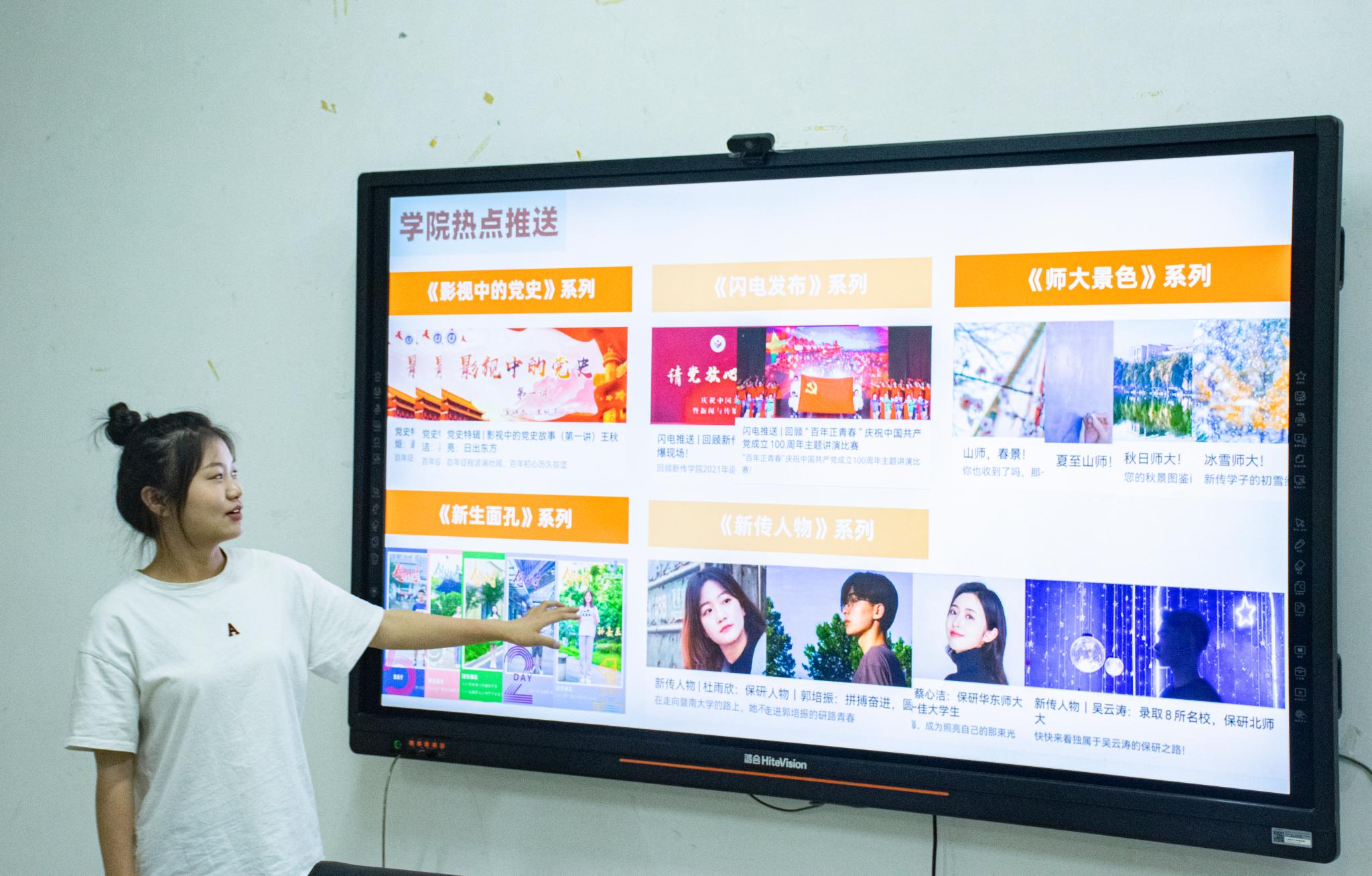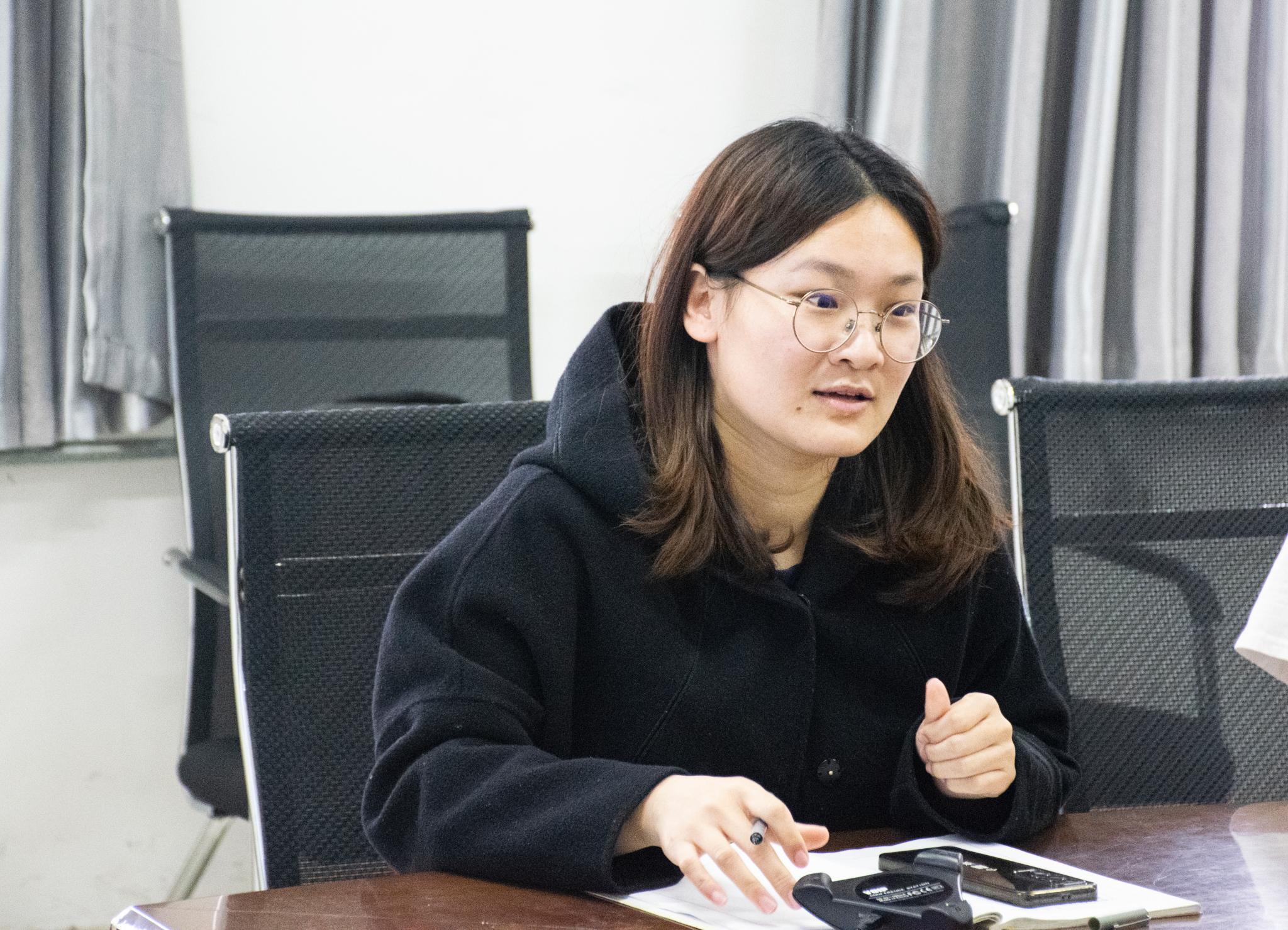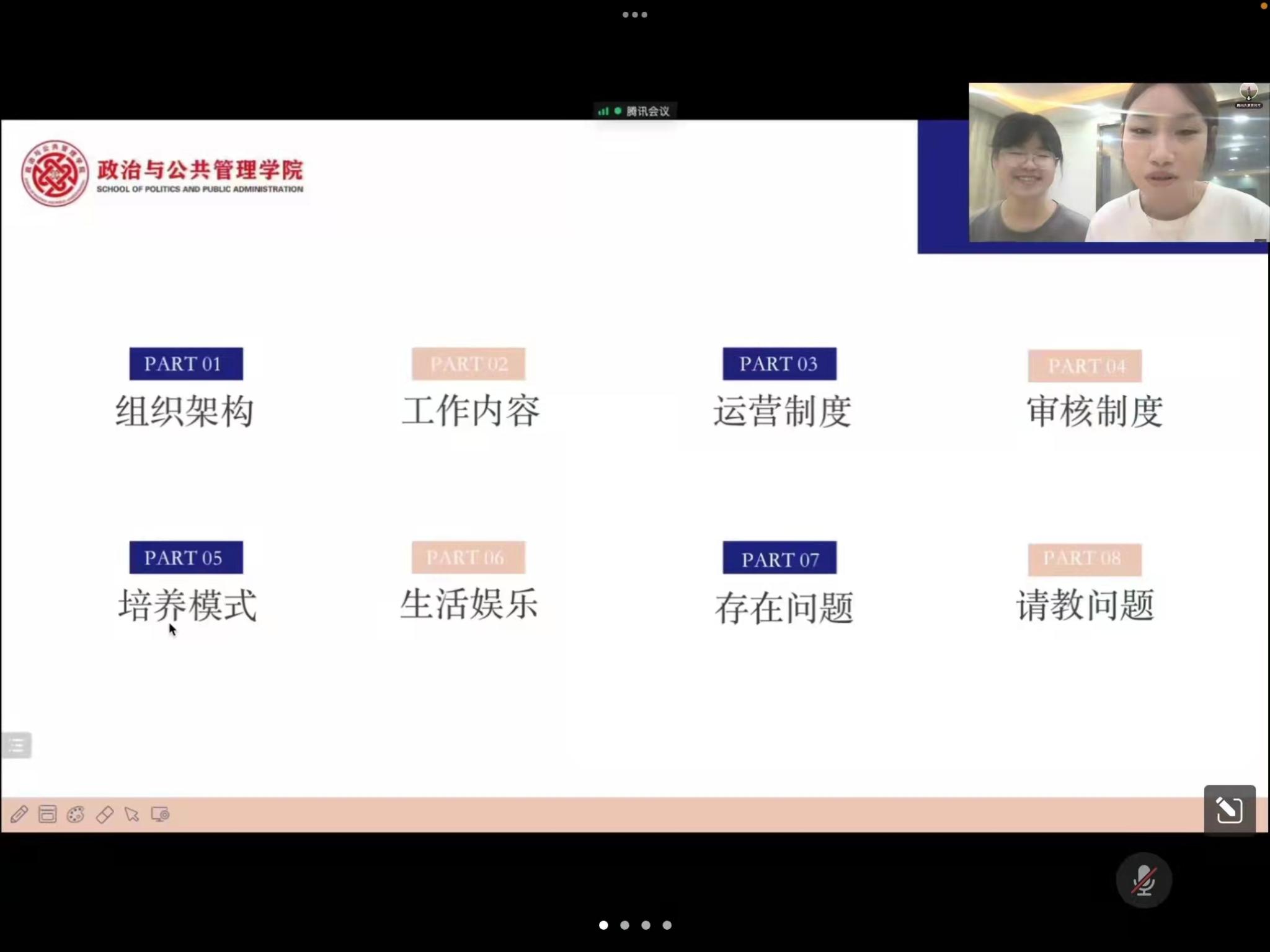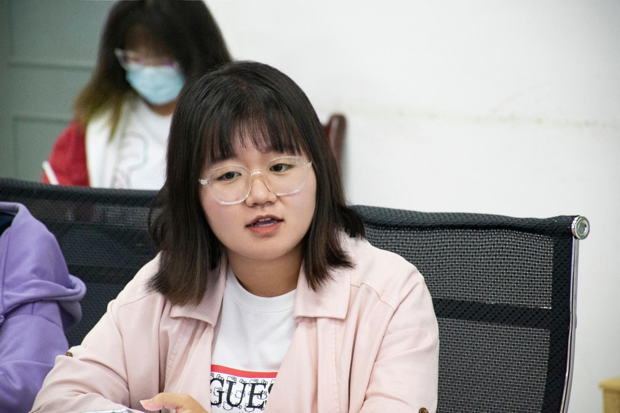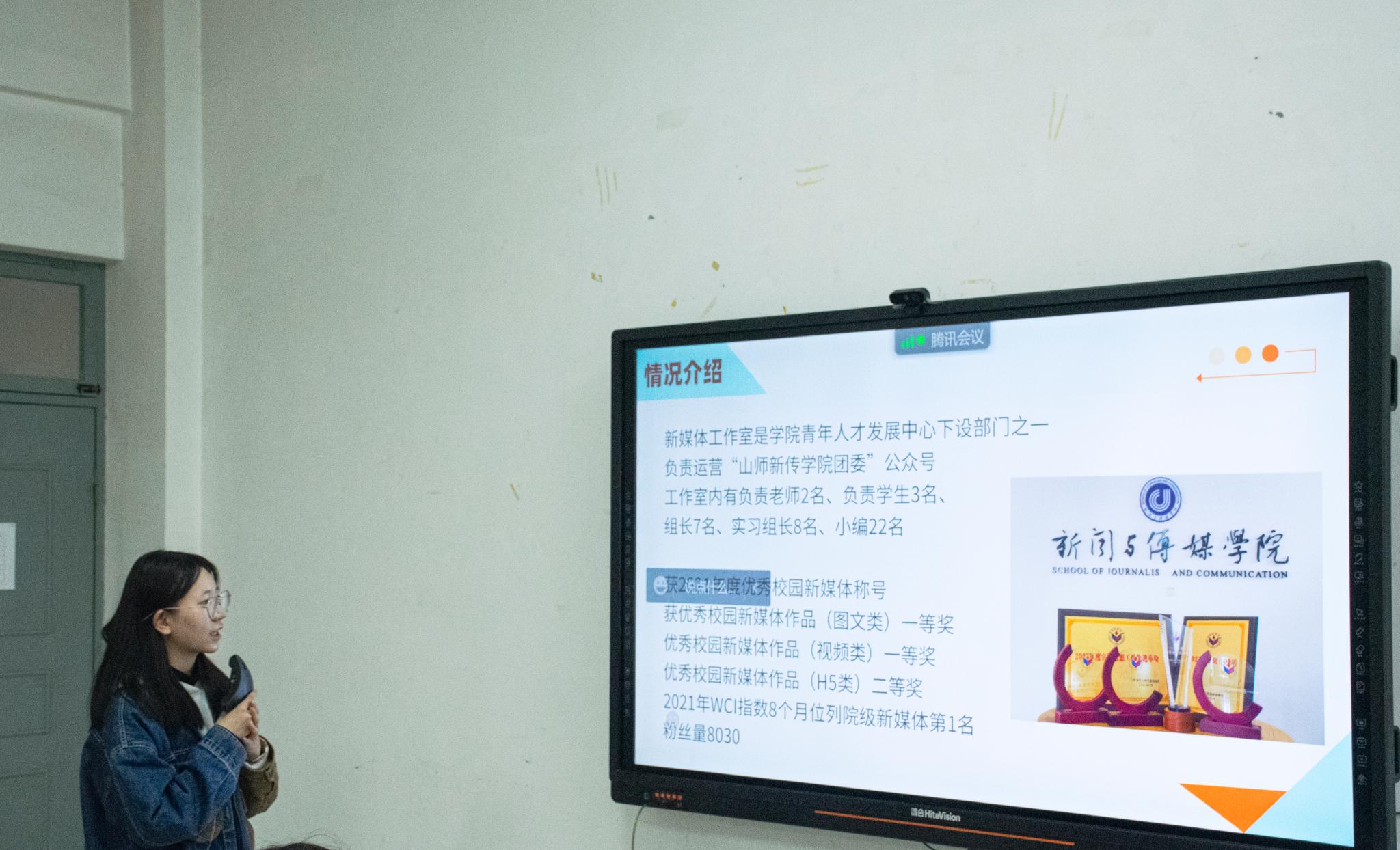 山青政管学院融媒体部长李佳梦从工作室组织架构、工作内容、特色版块、审核制度、培养模式、生活娱乐等方面展示了学院融媒体中心的工作情况。