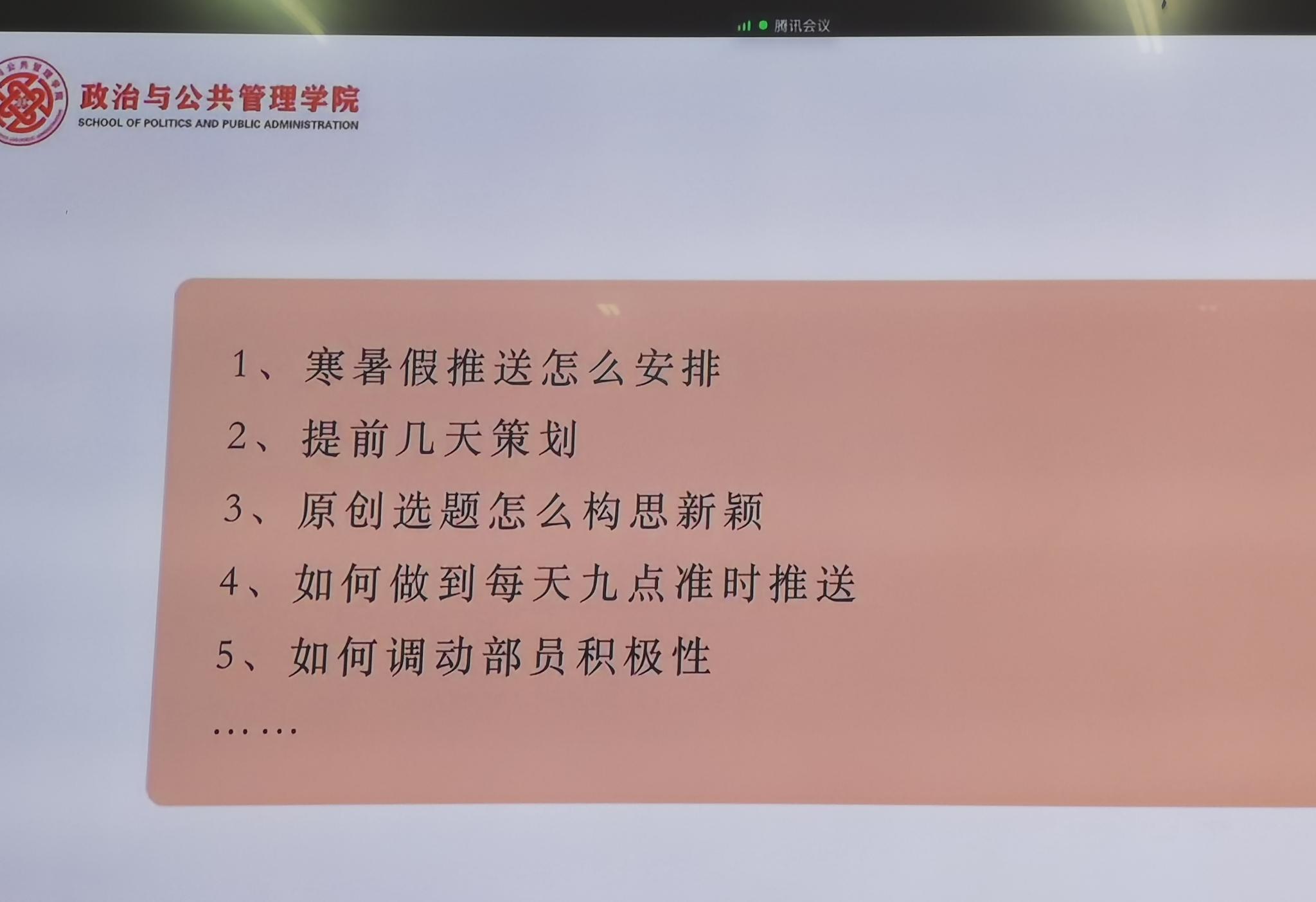 会上,两院新媒体工作室负责人分别介绍了工作开展情况并交流经验。陈涟漪详细讲解了学院新媒体工作模式和推文生产过程。孙艳以热点与创意作品为例,从选题和编辑两方面做了干货分享,认为推文要在内容和形式上借鉴优秀作品,多聚焦学院学子生活,找准学院风格,形成自身品牌。