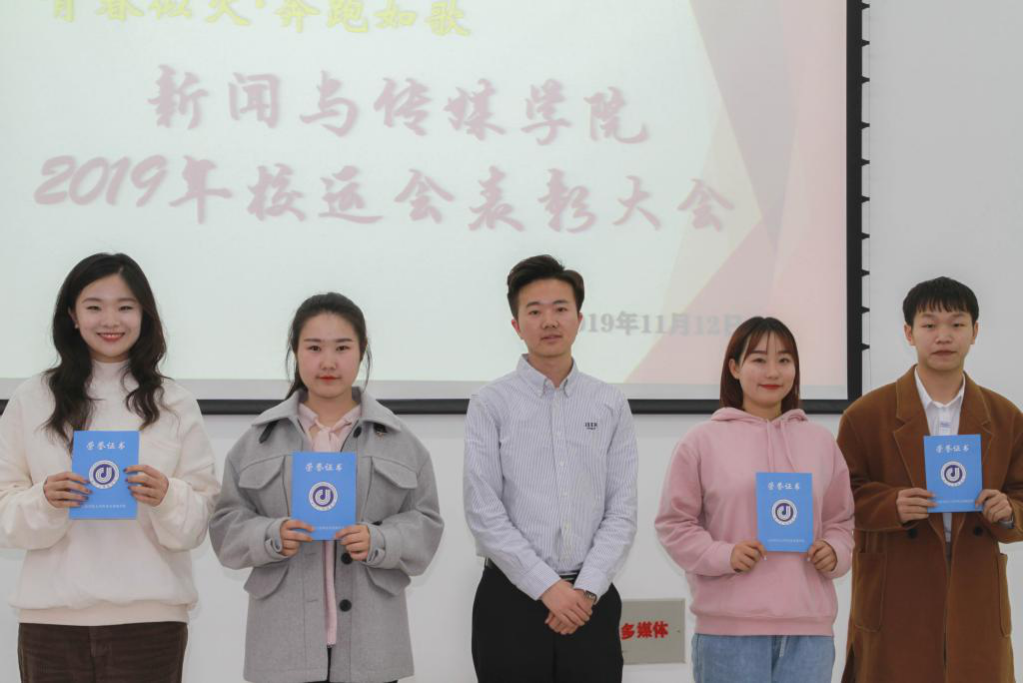 张慧、周楠、侯玉娜为获奖同学颁奖,并为获得“突出贡献奖”的优秀运动员颁发奖金。2018级播音与主持艺术专业王亦凡、栾晓翔朗诵《青春似火,奔跑如歌 ——致运动员》,声情并茂地道出对运动员的赞扬和骄傲。英国上市公司365田径队队员刘程瑞、谭鑫宇作为运动员代表发言,体育学院的孙睿代表教练员发言,总结了他们的校运动会心得体会。最后,楼雨杭再次对学院本届运动会所取得的成绩表示肯定,并表达了对明年运动会新传学院再创佳绩的期待。