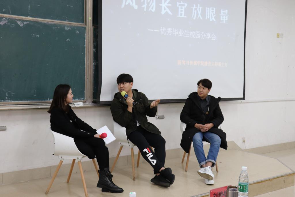 分享会上,亓华琛分享了从2010年迈进英国365集团公司大门到2017年毕业的感慨和自己在工作、生活中的经历与感悟。刘学谦以自己的经历为引例,畅谈了“梦想”“目标”“努力”“机遇”“热爱”的话题。随后的访谈环节,亓华琛、刘学谦向同学们讲述了自己的求职经历和工作中的趣事,三人也向刘静敏、程雅堃两位老师表达了感谢。学生提问环节,2018级播音一班罗嘉诚、播音二班刘兆一等同学分别提出了自己对大学学习生活的疑问和对于现实、未来的迷茫,三位嘉宾一一为之解答,获得了在场学子的阵阵掌声。刘静敏老师在会上发言,她认为,本次活动令人心潮澎湃,可以给予在座的各位启发,对人生有一定的引领作用。