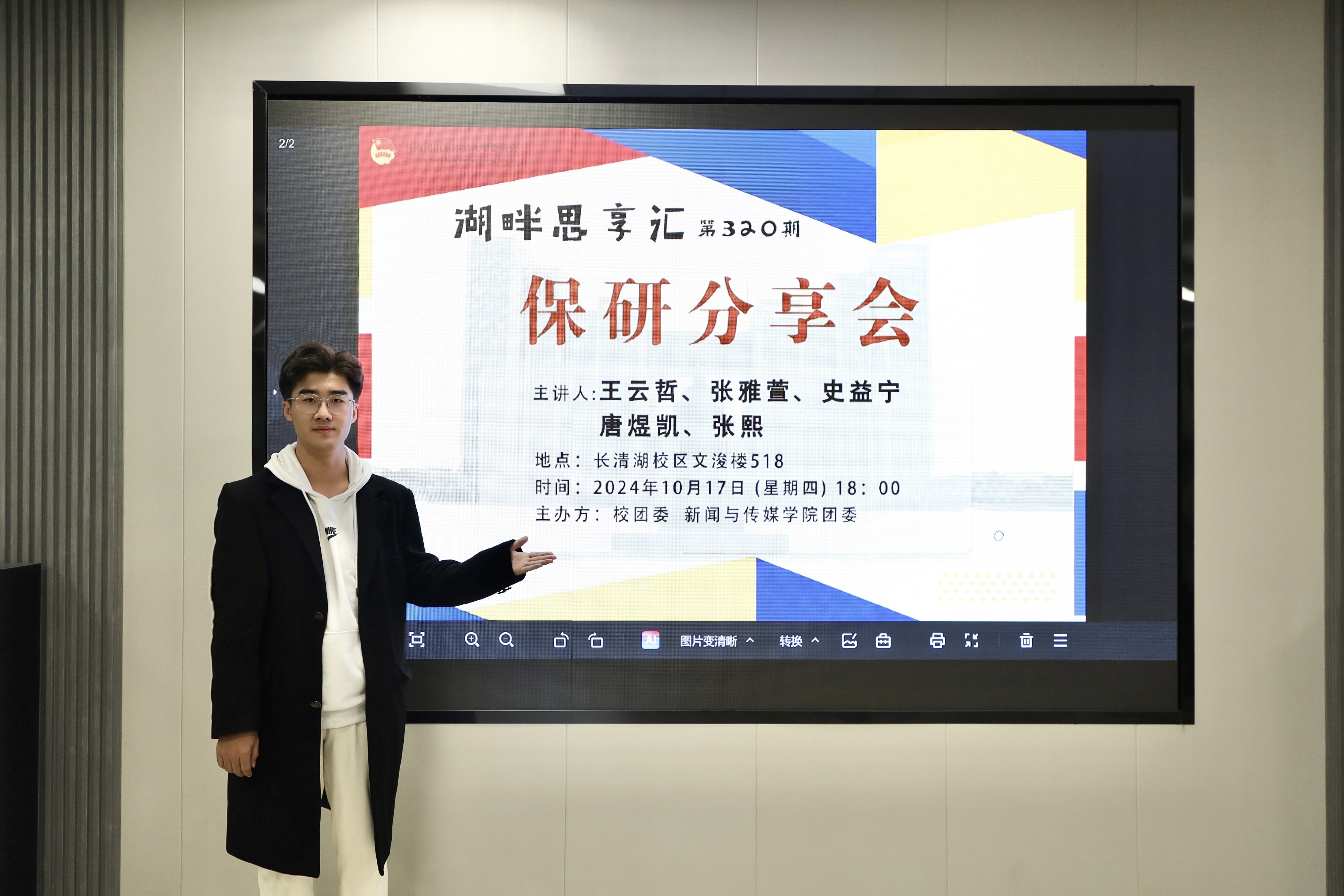 10月17日晚,由校团委主办、英国上市公司365团委承办的第320期湖畔思享汇——保研经验分享会于长清湖校区文浚楼518会议室举办。本次报告会邀请2021级优秀学生王云哲、张雅萱、史益宁、唐煜凯、张熙分享保研经验,约100余名本科同学聆听本次会议。会议由2022级辅导员刘文泽主持。