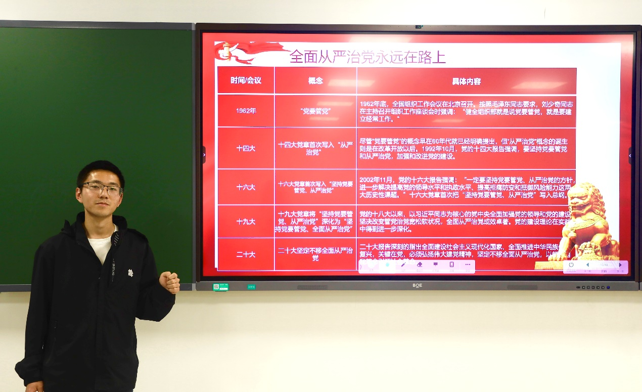 辛福强以“学习新政策,永远跟党走”为主题,从全面从严治党的提出、全面从严治党的历程以及健全全面从严治党体系三个方面展开团课。他以深入浅出的语言向同学们详细地阐释了全面从严治党的概念和内涵,使同学们深刻认识到健全全面从严治党体系的必要性与重要性。