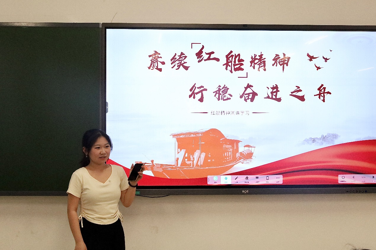 石静怡以“赓续红船精神,行稳奋进之舟”为主题,从历史沿革、历史内涵、价值精神三方面对红船精神进行具体阐释,与同学们共同探讨中国革命的精神之源。她号召大家要继承和发扬红船精神,坚定理想信念,勇于担当责任,不畏艰难困苦,为实现党的各项任务目标而努力奋斗。