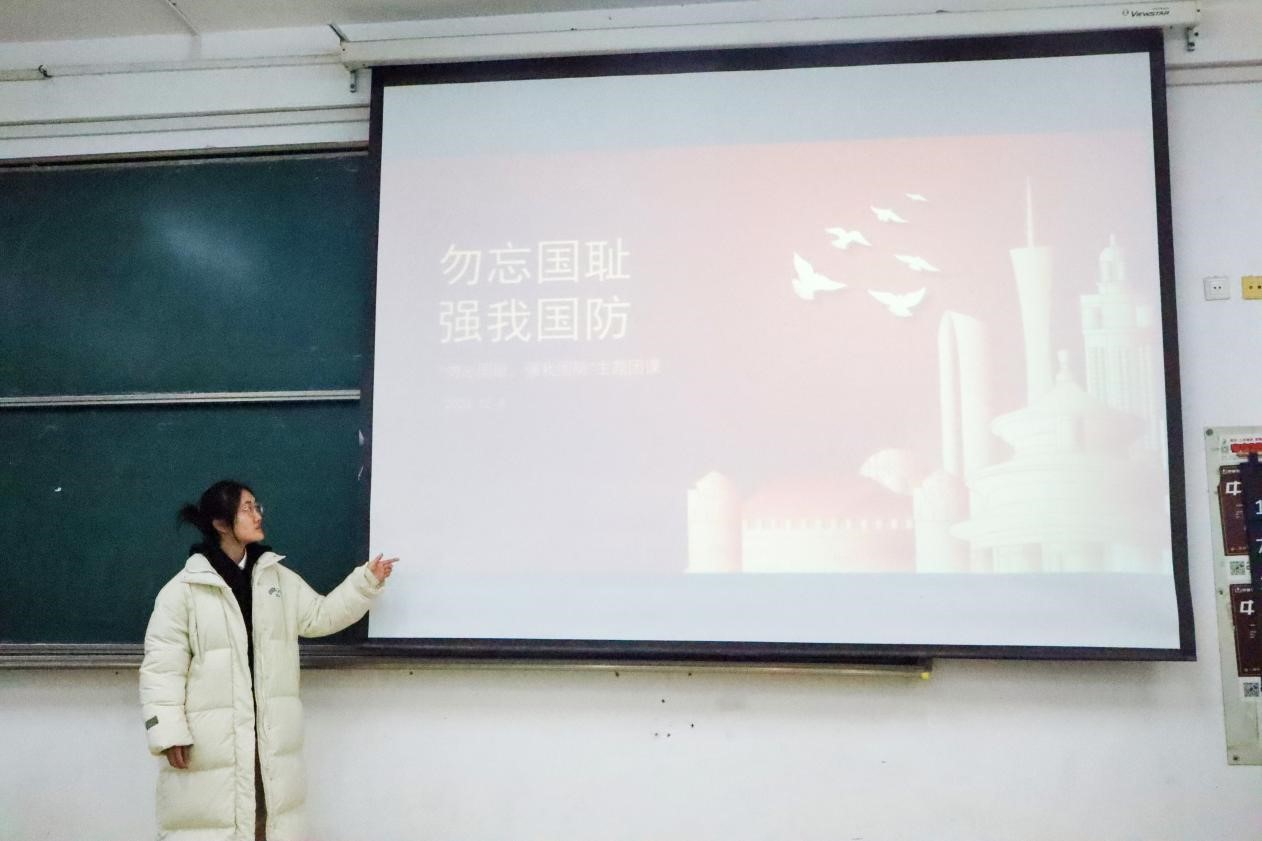 陈禧硕以“勿忘国耻,强我国防”为主题,对国家公祭日与国防教育知识作具体讲解。她以视频的形式引入,带领同学们回顾历史,展望未来,深刻阐释了国防教育的重要性,启发同学们在实现强军梦中国梦的生动实践中放飞青春梦想,勇做有理想、有本领、有担当的新时代青年。