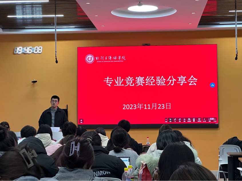 来自20级广播电视编导专业的李苇航为大家分享了广告类竞赛的经验。李苇航从个人竞赛经历角度,从广告制作流程、策略单解读、撰写分镜头脚本等方面为与会同学展示并分析制作参赛作品思路、分享拍摄广告心得、解答与会同学疑虑,为同学们准备竞赛提供了别开生面的思路。