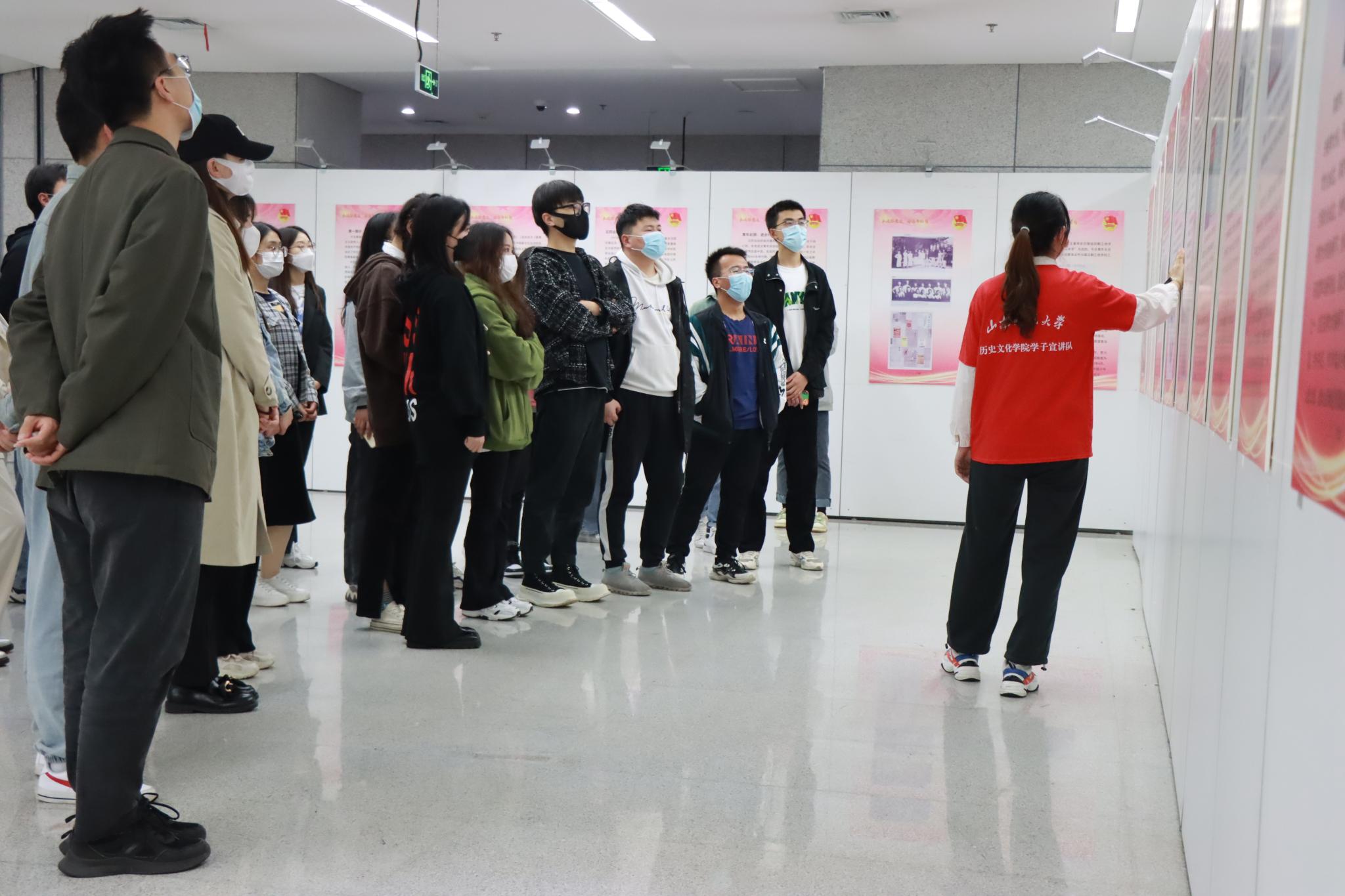 4月28日下午,学院组织全体本科生党员在图书馆一楼观看“喜迎二十大,永远跟党走,奋进新征程”主题团史展览,学院邀请到历史文化学院宣讲队的同学代表为全体本科生党员做讲解。