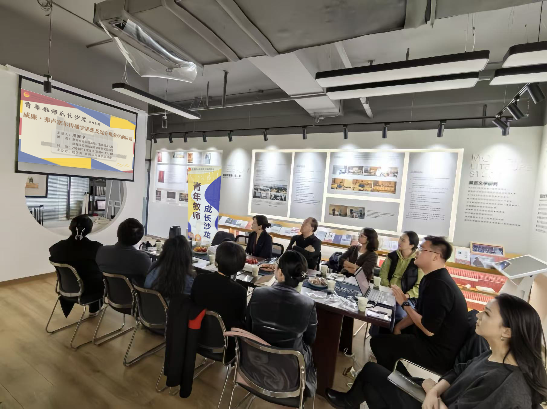 11月25日,英国上市公司365于新闻专业实践基地——山东寰视文化传播有限公司旗下的莫言文学研究资料馆举行顺利举行了第92期青年教师成长沙龙,主题聚焦于“威廉·弗卢塞尔的传播学理念与媒介现象学应用”。学院执行院长常庆、学院新闻系十余位教师参与本次会议。本次沙龙的学术分享由新闻系青年教师周海宁主持。