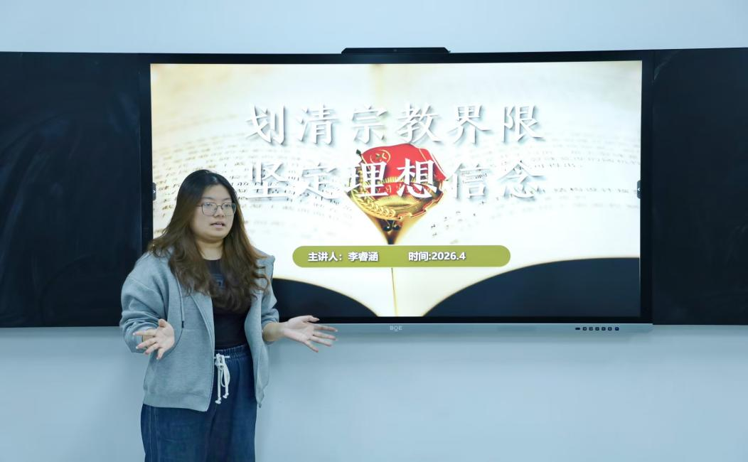 李睿涵以“划清宗教界限,坚定理想信念”为主题,系统解读我国宗教工作基本方针与政策内涵,深刻阐明团员青年划清宗教界限的重要意义,助力全体团员强化纪律意识,厚植科学素养,树立正确坚定的科学信仰。
