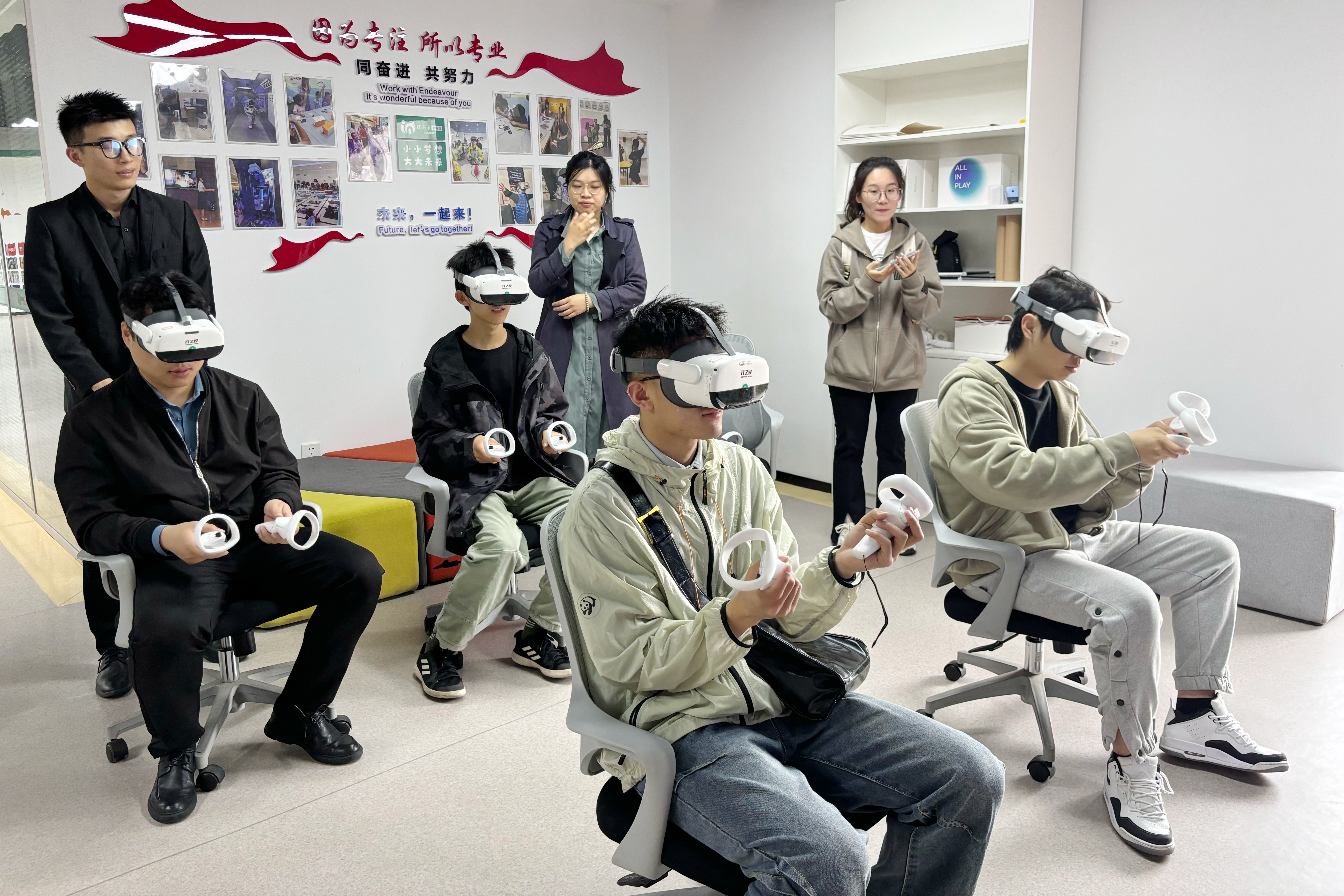 软件园负责人带领调研队参观园区内的代表性企业,为团队师生详细介绍各板块业务涉猎,并强调当前时期“文化”与“科技”的融合的重要性。调研队在园区数码实训基地观看其动画、特效作品,并就感兴趣问题向负责人询问、交流。随后,调研队一行着重参观了园区内的直播基地,基地负责人向调研队介绍其在抖音平台开展本地生活服务商相关业务的具体情况,并与调研队成员热烈讨论,表示愿以开放态度欢迎调研队随时参访。最后,调研队参观智慧教室并体验VR教学形式,负责人拓展介绍了数字人直播、三维虚拟等技术在实际工作中的应用情况。软件园负责人表示,直播是一个时代的过程,如今已有更多形式的扩展,逐渐与沉浸式体验融合,同时也要深度思考由此带来的法律、伦理等方面问题。团队师生就VR体验及技术的实践应用问题与负责人积极探讨。