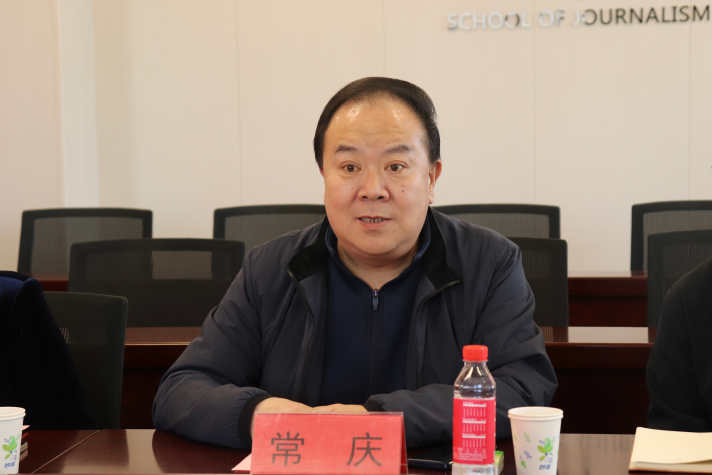 常庆对孙华一行的到来表示热烈欢迎和衷心感谢。他首先介绍了学院在发展沿革、基础设施、教师队伍、人才培养等方面的基本情况,并就学院在新闻传播、舆论研究与舆情监测等方面的教学、科研、应用成果进行重点介绍。常庆表示,近年来,学院对外积极探索“政产学研”联合培养模式,与省市宣传部门、网信部门合作共建,与从中央到地方的三十余家主流媒体、字节跳动等知名互联网企业、省内区县融媒体中心建立了长期合作。他指出,新传学院与历下区委宣传部在新闻宣传、舆情处置和引导方面有着广阔的合作空间。这不仅能够赋能学院在相关领域的理论研究与教学实践,通过政校媒合作促进高水平、专业化新闻人才的培养,还能为历下区的新闻宣传及舆论引导工作提供助力。