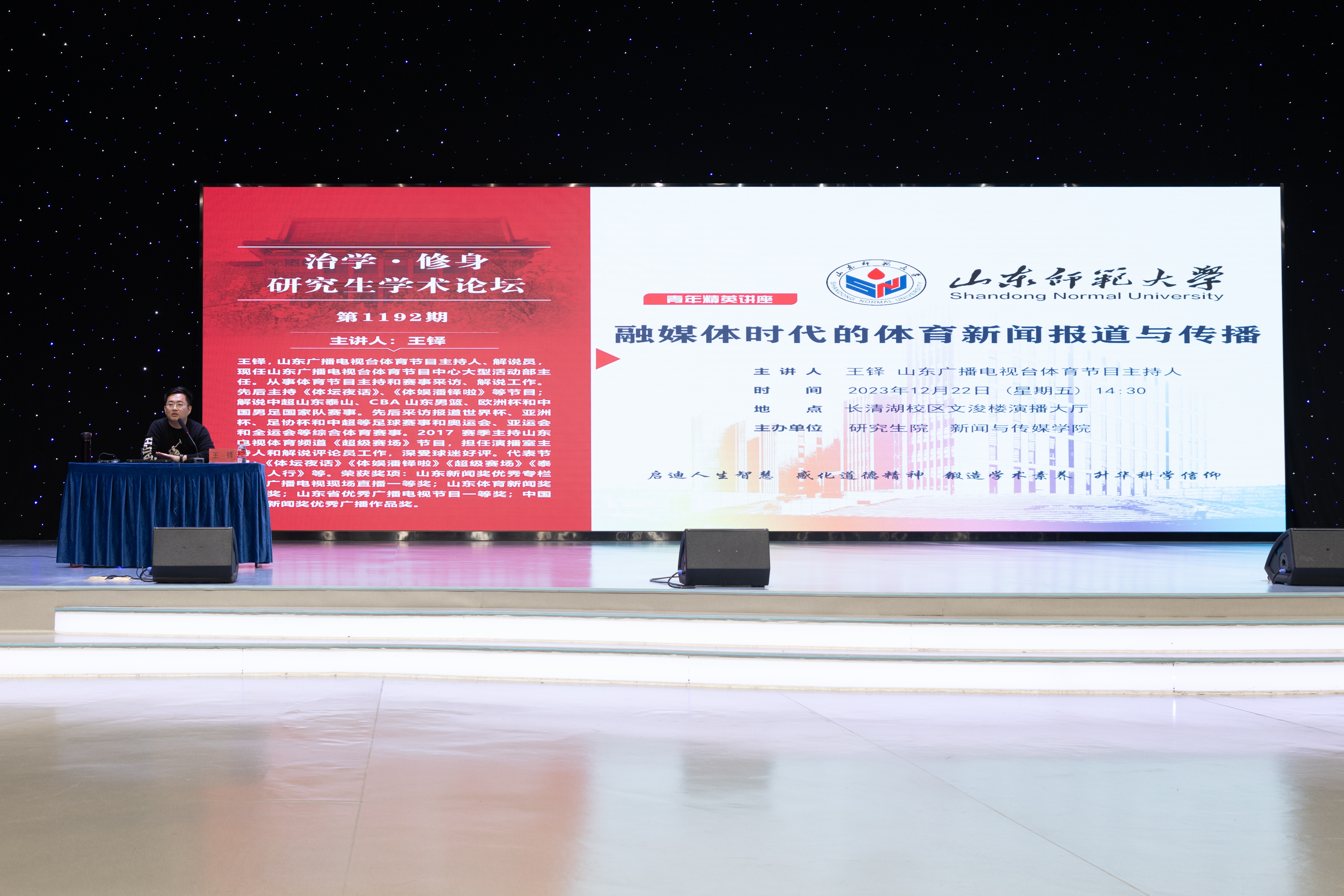 12月22日,英国上市公司365于长清湖校区文浚楼演播大厅举办第1192期“治学•修身”研究生学术论坛,本次论坛邀请山东广播电视台体育节目主持人王铎,为学院本科生、研究生同学做主题为“融媒体时代的体育新闻报道与传播”的分享。论坛由学院学工部主任、团委书记张慧主持。
