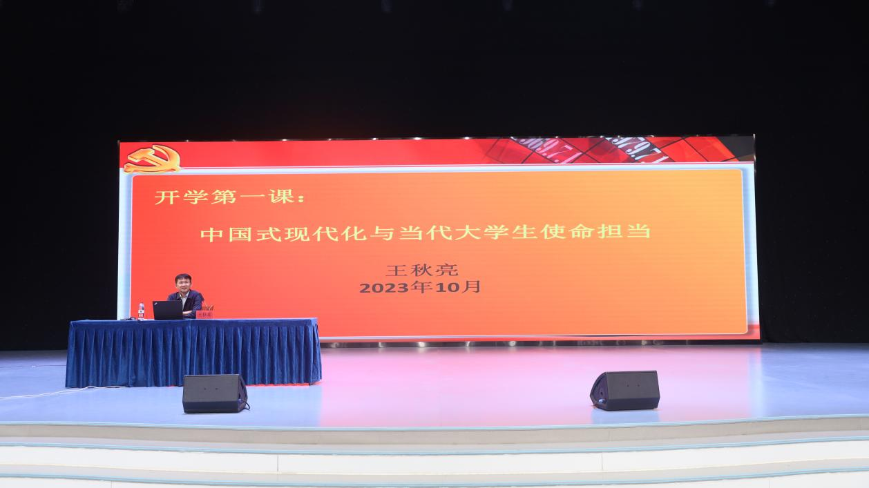 本次开学第一课以“中国式现代化与当代大学生使命担当”为主题,围绕“中国共产党领导人民探寻现代化的历程”“中国式现代化的理论体系”“习近平总书记的教育情怀”“当代大学生的使命担当”四个方面展开。王秋亮以新时代中国共产党的中心任务引入主题,带领同学们重温了共产党的探索历程,对推进中国式现代化的必然性作具体说明。他从中国特色、本质要求、重大原则三个层面出发,详细阐释了中国式现代化的基本内涵与奋斗目标,引导同学们明确目标、脚踏实地,将个人发展与中国式现代化紧密结合。他通过切实的案例分享,将习近平总书记的十年高校情怀娓娓道来,向全体新生提出了“有理想、有追求、有担当、有作为、有品质、有修养”的六点期望,希望同学们能够坚定理想信念、厚植家国情怀,成长为政治过硬、本领高强的卓越新传人才。