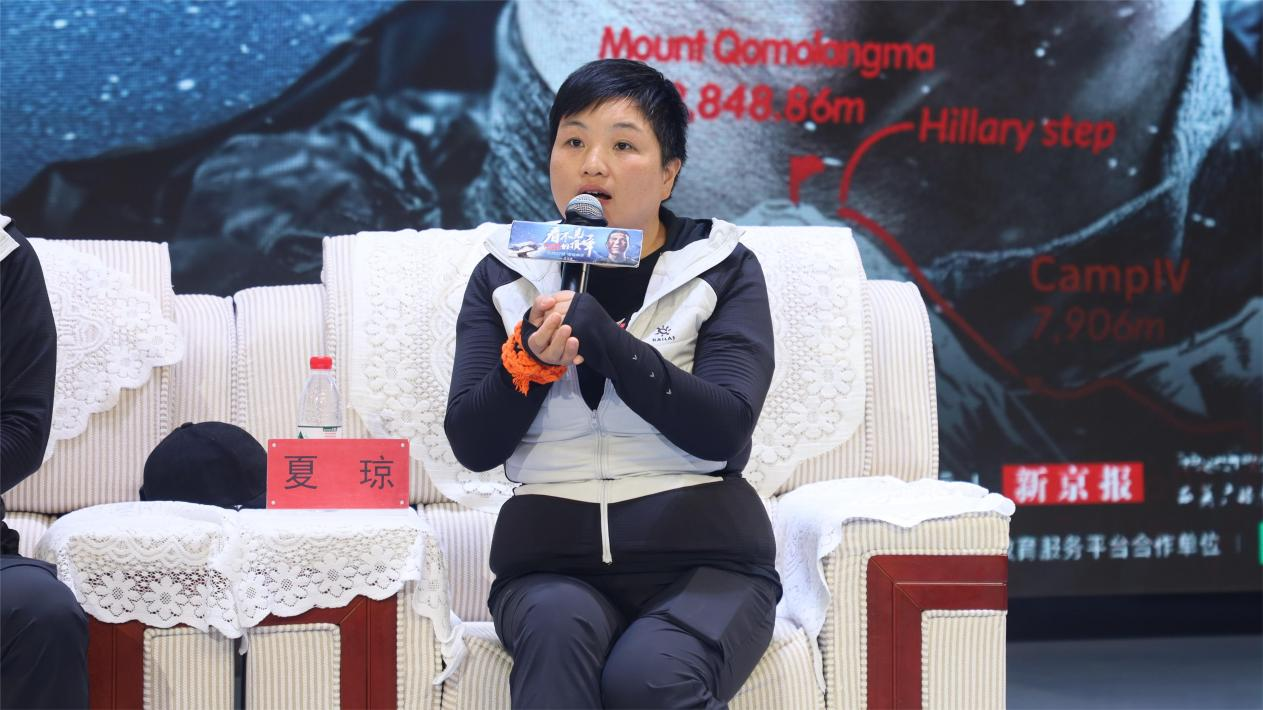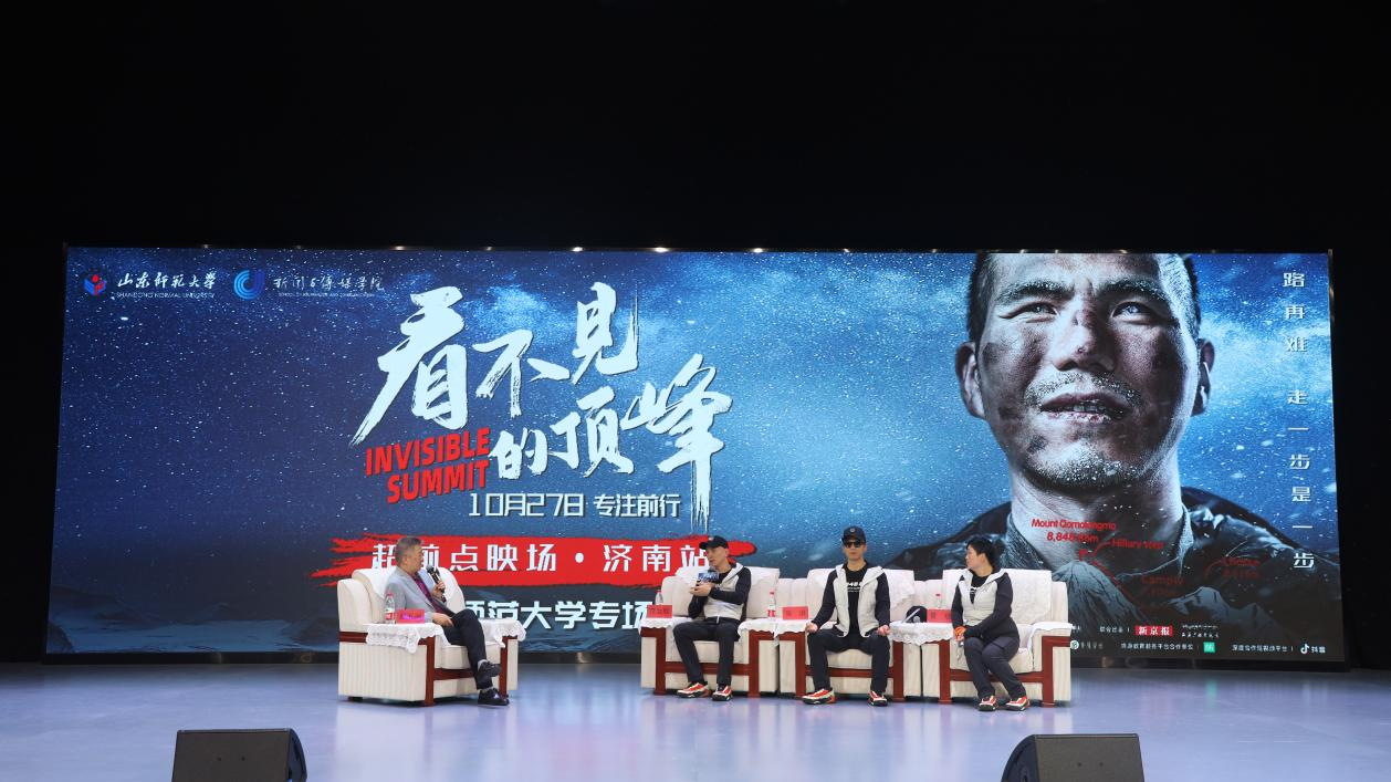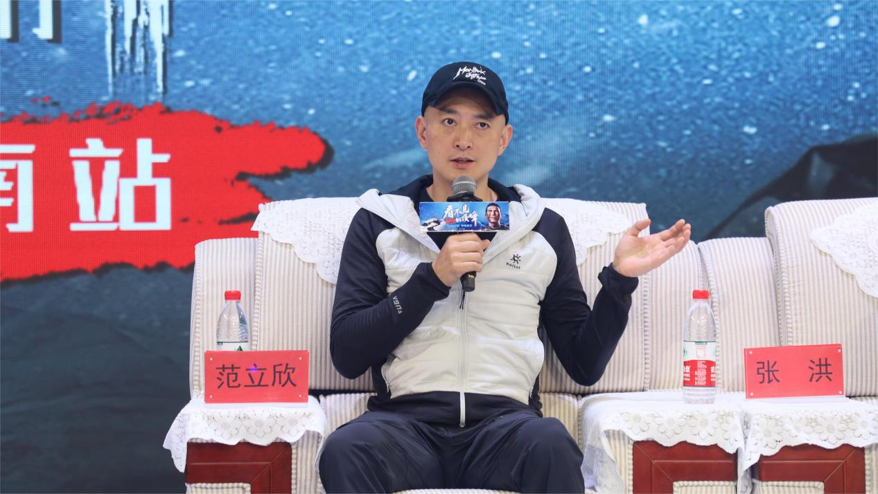 见面会分为主创成员访谈与创作经验分享两部分。在访谈中,张洪向在场同学分享了自己的人生历程与攀登体验,他认为最难的其实并非攀登本身,而是内心的未知与犹豫,在汗水与泪水中磨砺的信念正是比物质财富更宝贵的东西。他着重强调了“信任”在攀登过程中的重要性,对妻子与登山队员的一路支持与陪伴表示感谢。他向同学们分享登山后的心理变化,鼓励同学们坦然接受生活,勇敢面对挑战。夏琼在访谈中表示,作为一名妻子,她对张洪的珠峰攀登之路始终坚定支持;作为一名医生,她对生命始终保持着高度敬畏。她坚信每个人都有不同的闪光点,张洪在让自己生命再放光芒的同时,也照亮了夏琼的梦想。