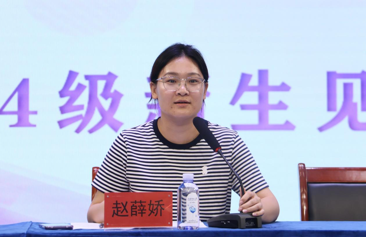 赵薛娇开展安全防范和心理健康教育,引导新生筑牢安全底线,建设心灵家园,以良好的心态应对未知挑战。另外,她向同学们介绍了新生的班级助理及军训教官,对军训具体事宜进行安排,勉励同学们以饱满的热情在新传大舞台上绽放闪耀光芒。