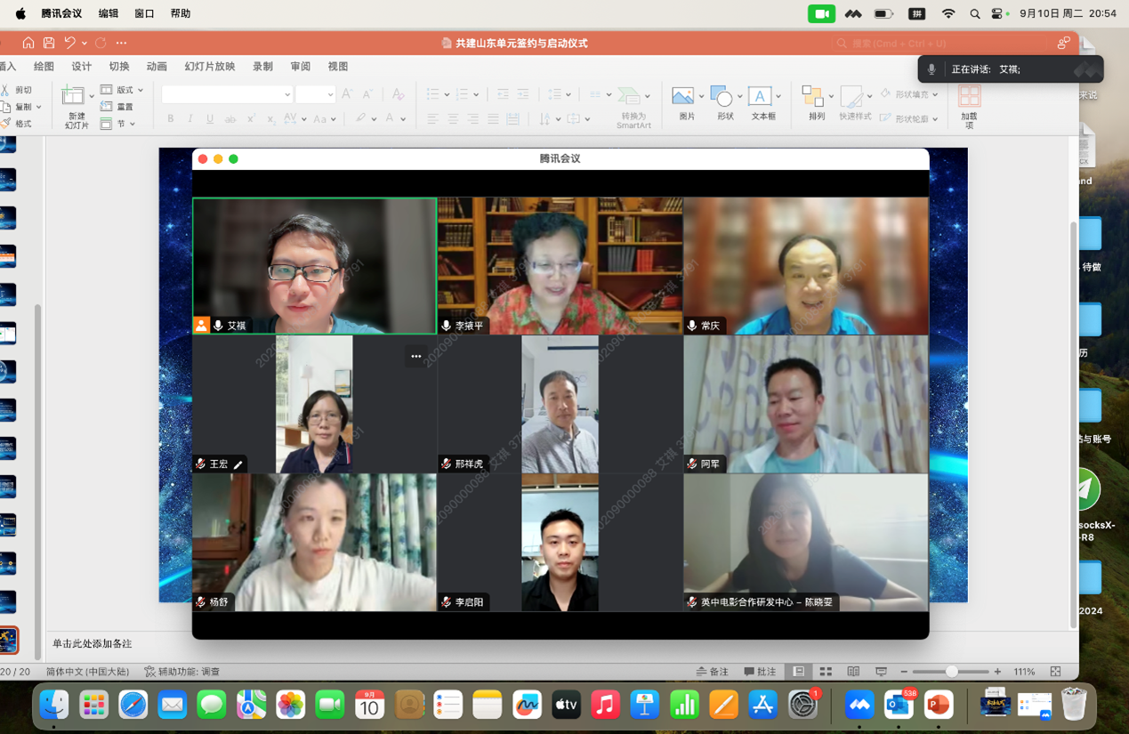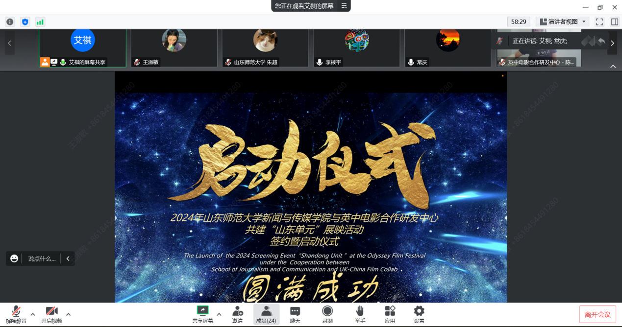 首先,艾祺老师从项目合作方、合作目标、合作内容、合作机制、合作基础以及合作展望六部分对项目内容进行详细阐述,并对项目进展情况作进一步总结说明,包括已完成的影片拍摄筹备工作、征集筛选工作以及即将开始的展映工作。随后,双方共同签署合作协议,并相继发言致辞。英中电影合作研发中心陈晓雯教授对英中电影合作研发中心和英国Odyssey电影节品牌背景作简要介绍,期待通过“山东单元”展映活动向世界展示山东的电影艺术与文化魅力。李掖平教授分享了对于“山东单元”展映活动的独到见解,给予高度赞扬,并对未来的合作交流提出展望。常庆院长总结发言,表示此次合作将为我院师生提供更为广阔的实践舞台,有助于推进专业发展和学科建设,对于加强国际合作、开展国际文化传播交流具有重大意义。最后,与会双方就后续合作规划进行了深入探讨,譬如学术交流合作、实践教学合作和共建影展活动等,旨在促进人才培养,拓宽国际视野。