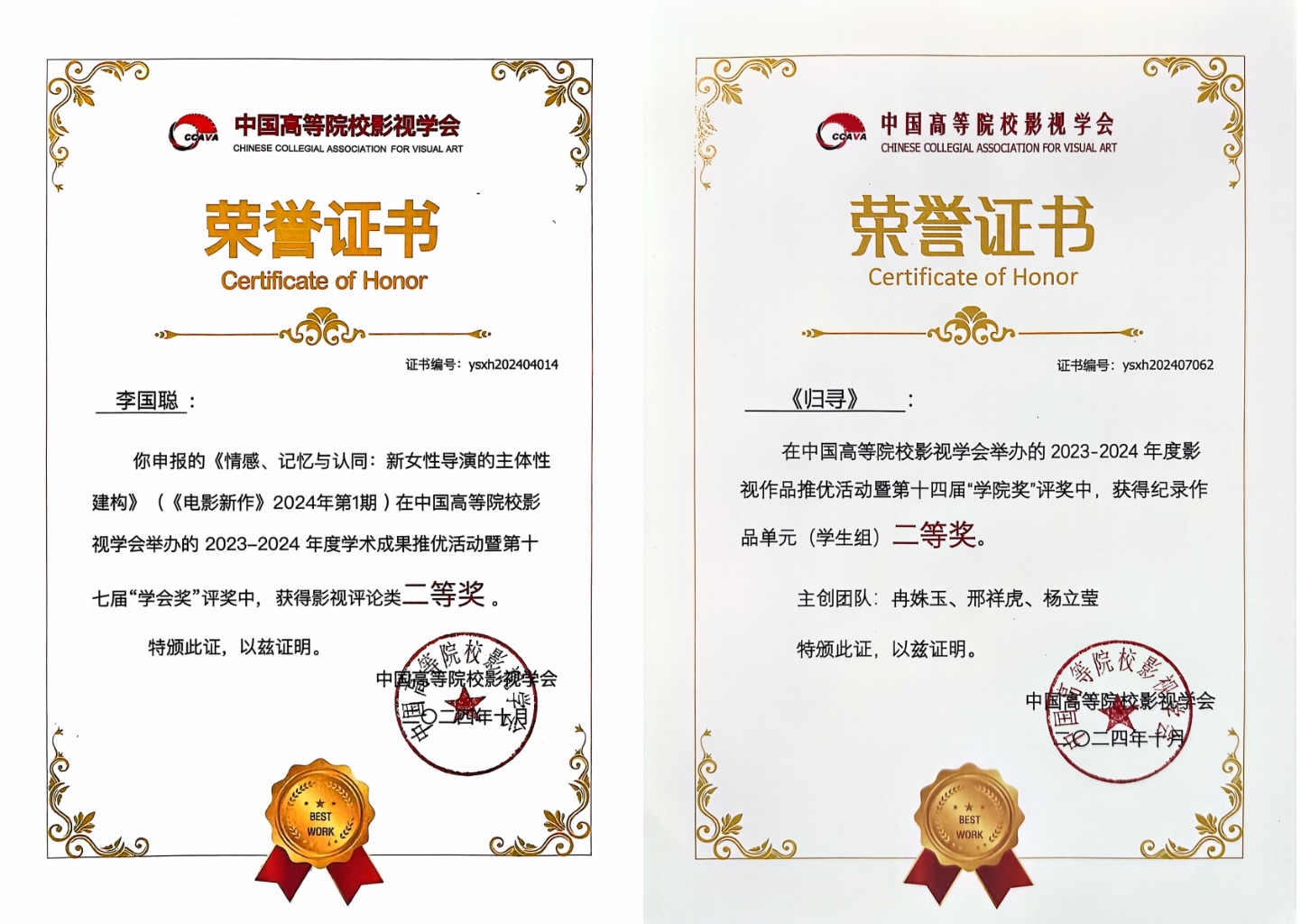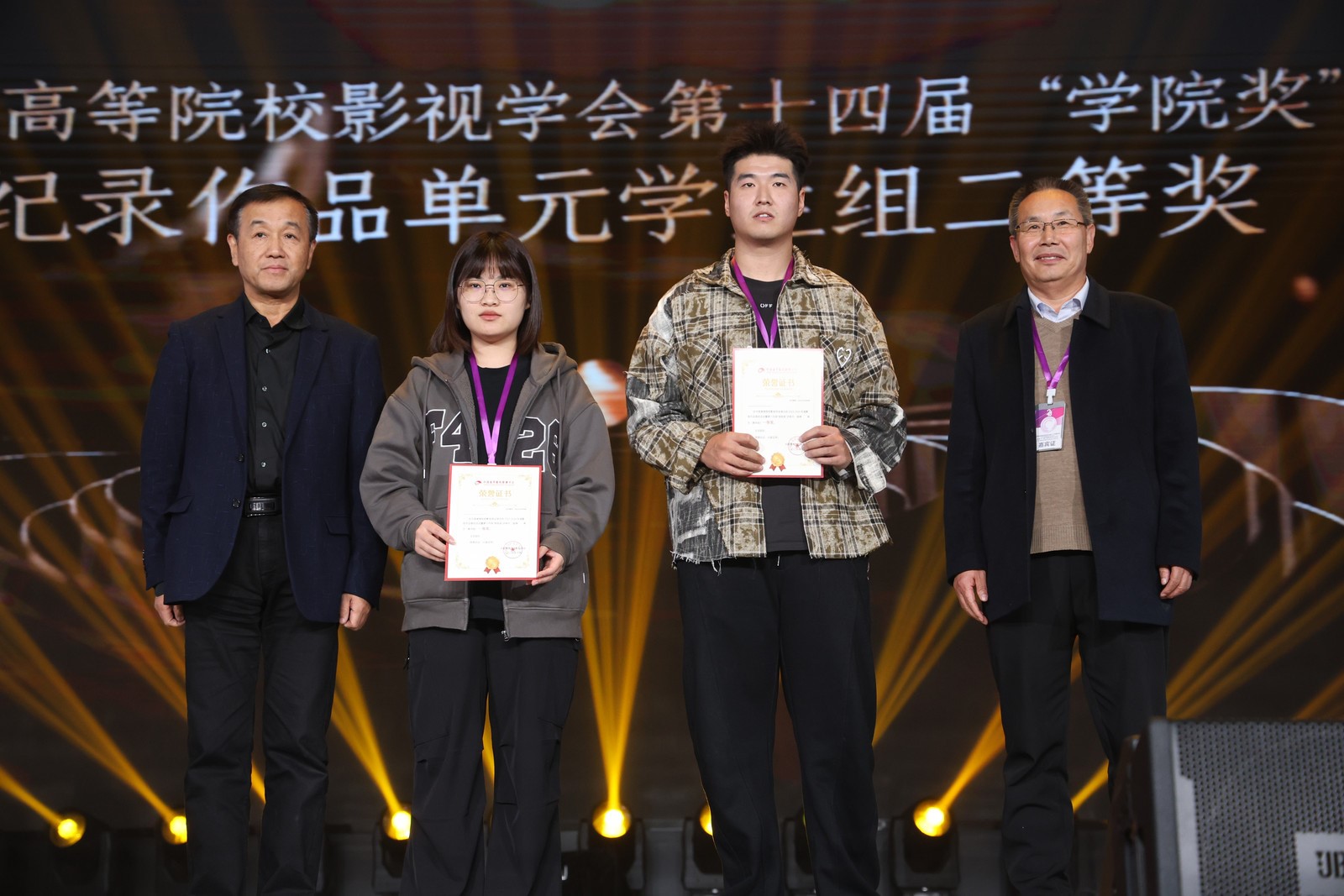 在2023-2024年度影视作品推优活动暨第十四届“学院奖”颁奖仪式上,电视编导系冉姝玉、邢祥虎、杨立莹主创的纪录片《归寻》获得学生组二等奖。