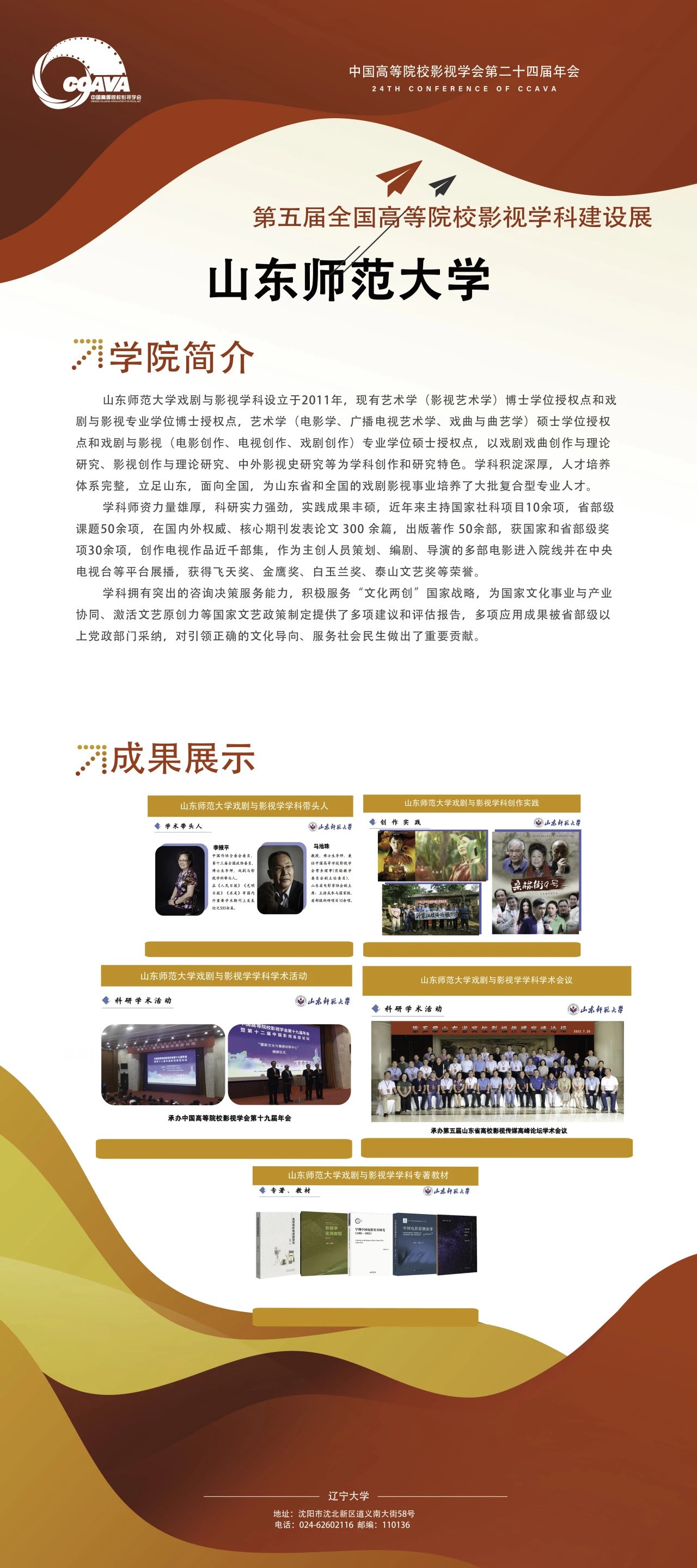 2024年10月26日,中国高等院校影视学会第二十四届年会暨第十七届中国影视学术论坛在辽宁大学隆重开幕。本届年会由中国高等院校影视学会与辽宁大学联合主办,学会秘书处与辽宁大学广播影视学院联合承办。来自众多高校的700余位专家学者齐聚一堂,围绕“新时代 新使命:中国影视与中华民族现代文明建设”主题,深入探讨中国影视如何在新的起点上推动文化繁荣,建设文化强国,建设中华民族现代文明。我院电视编导系教授马池珠、李茂民、赵五洲,戏剧影视系副教授苗元华,青年教师周楠、高帆、董传礼,研究生曹海婷参加了会议。