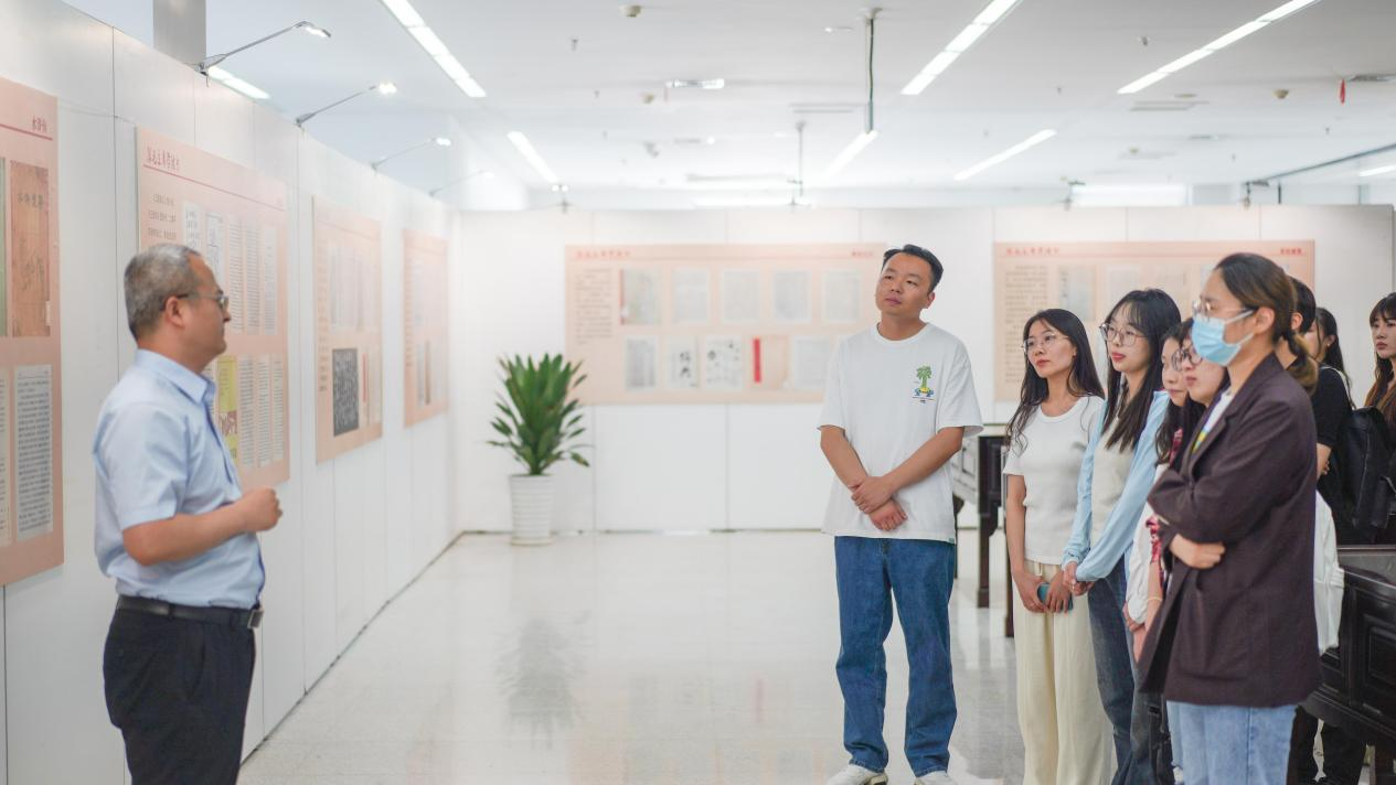 此次展览展出图书馆馆藏毛主席阅读书目150余册,以丰富的文献资料展现了一代伟人的崇高理想追求。讲解员马继业按照时间顺序介绍了毛主席曾批注的历史书籍、古典小说、马列著作以及古典诗词,展示了毛主席创作的诗词、读书笔记、学术文章等,让党员们切实感受到毛主席孜孜不倦、锲而不舍的读书态度。同时,马继业带领大家回顾了毛主席在青年时代从中国传统文化中汲取营养,到接触《新青年》《共产党员宣言》等革命书刊,实现了从传统进步知识分子到马克思主义者的初步转变,再到深入研究马列著作,将马克思主义基本原理与中国革命与建设实践相结合,最终形成了毛泽东思想的历程。
