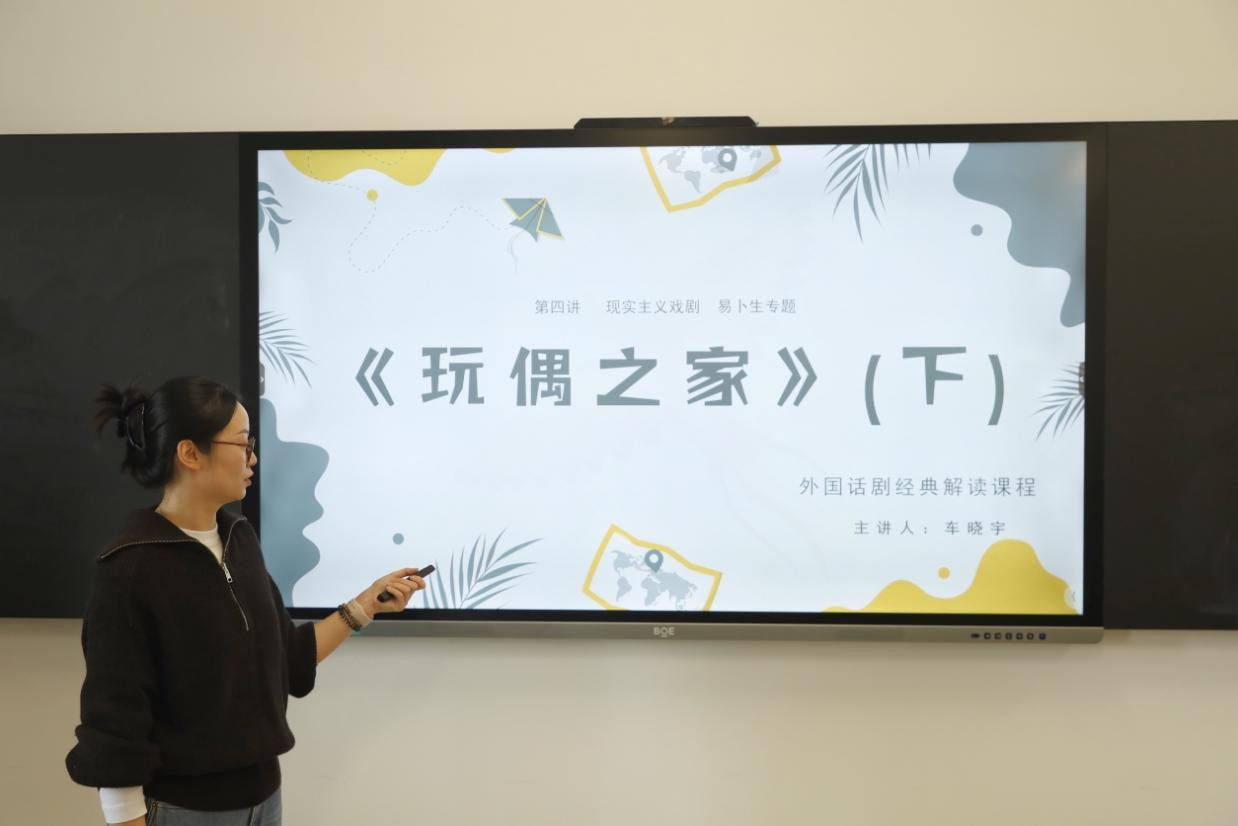 车晓宇本次公开展示的课程是《外国话剧经典解读》。在课堂展示环节,车晓宇对经典作品《玩偶之家》进行剧情精讲,用戏剧学理论的方式重新打开《玩偶之家》。她通过对戏剧结构的互动分析激起学生的课堂兴趣,突出了《玩偶之家》的回溯式戏剧结构与传统戏剧结构的差异,引导同学探寻自我价值。
