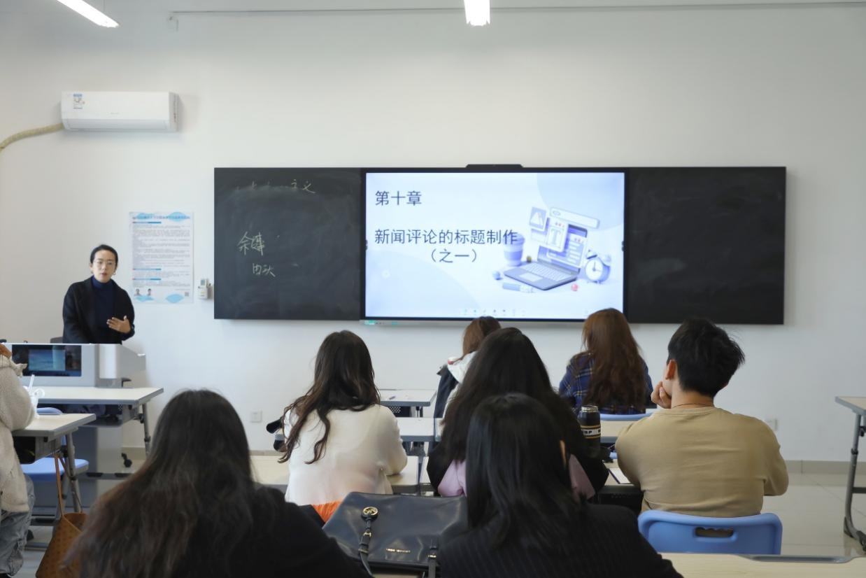 本次公开课分为课堂展示和课后研讨两个环节。在课堂展示环节郭洁的《新闻评论的标题制作(之一)》主要从新闻评论标题概述和新闻评论标题分类两大章节展开课程。她带领同学们聚焦网络时代下的具体实例,并以学生的新闻评论实践作业为例,对新闻评论标题的功能、分类和修辞进行了生动阐述,同时启发同学们在创作标题时需注重标题内涵、考虑时代意义。
