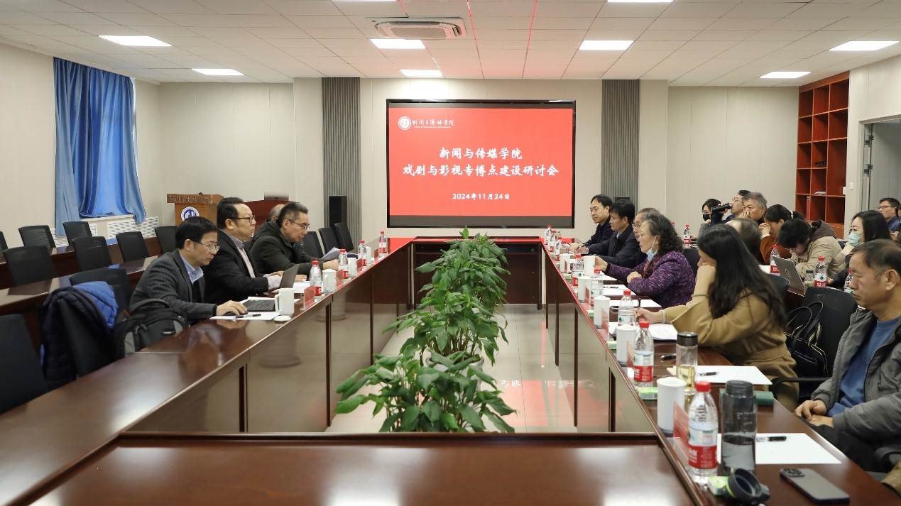 11月24日,学院于文浚楼518会议室召开戏剧与影视专博点建设研讨会。中国电视艺术家协会副主席、北京师范大学艺术与传媒学院教授、教育部“长江学者”特聘教授胡智锋,北京电影学院研究生院院长、图书馆馆长、教育部“长江学者”特聘教授王海洲,浙江大学国际影视发展研究院执行院长、浙江传媒学院华策电影学院院长、国家“万人计划”哲学社会科学领军人才范志忠,西北大学电影学院院长、陕西省电影家协会主席张阿利莅临会议。学院戏剧与影视学科负责人、教师参与会议。会议由学院党委书记王秋亮主持。