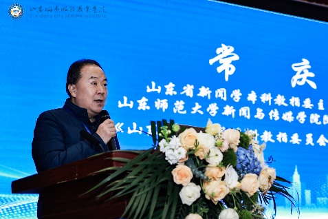在山东省新闻传播学高质量发展论坛环节,张冠文以“期刊选文的标准及对青年学者的建议”为题作主旨发言,介绍了《英国365集团公司学报》的基本情况,并对青年学者在学术研究中应该如何确定方向、谋划选题,以及如何向期刊投稿提出了明晰的建议。常庆作为山东省新闻学本科教指委主任委员,做山东省新闻学本科教学指导委员会年度总结发言,指出了教指委本年度的工作重点与成绩,并对未来教指委的工作要点进行部署。