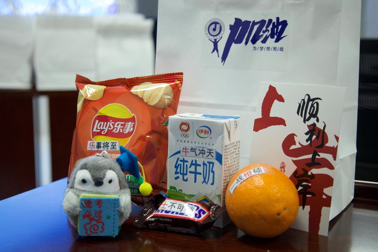 活动现场,老师们为即将奔赴考场的同学们送上了精心准备的“考研暖心加油包”,加油包中装有的乐事薯片、纯牛奶、士力架、橙子、加油卡片以及“逢考必过”企鹅小公仔,寓意着“乐事将至”“牛气冲天”“势不可挡”“一战成名”。加油包的传递是祝福的传递,它承载着学院对考研学子无微不至的关怀,让同学们在紧张的备考中感受温暖,更加坚定了为梦想拼搏、勇创佳绩的决心。