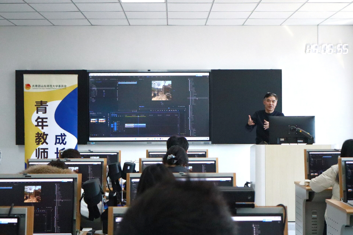李大锦以"VR赋能教育"为核心,围绕VR是什么、VR影视的叙事和关键问题三个方面进行了全面介绍。李大锦指出VR是全景影像应用到实践中的结果,通过第一人称的叙事视角以及多线索、非线性的叙事结构,大大增强了观众的沉浸感和自主性,提升了观众与影片中人物的互动感。同时,他结合丰富的案例剖析了VR影视关于选题、叙事结构、拍摄、剪辑、配音五个方面的关键问题。在交流互动环节,现场示范VR影视的剪辑过程,师生们戴上设备亲历虚拟场景的交互设计,亲身体验VR影视创作的魅力。