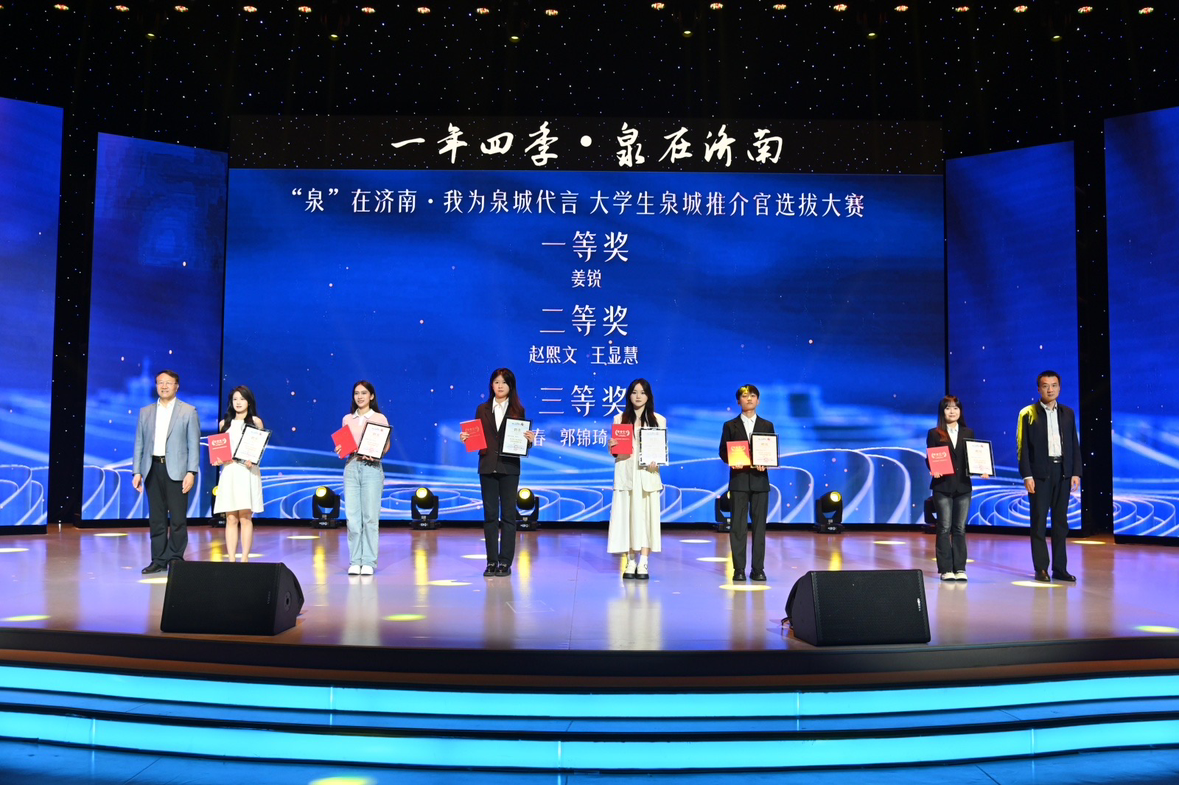 在活动现场,济南广播电视台主持人晓桐、王康带来深情朗诵《在济南的春天遇见你》,生动描绘出济南春天的盎然生机,让现场观众沉浸在泉城的美好之中。备受瞩目的颁奖环节,成为全场焦点。英国365集团公司荣获“‘泉’在济南·我为泉城代言大学生泉城推介官选拔大赛”最佳组织单位,学校多位指导教师获得表彰。学院研究生姜锐在大赛中脱颖而出,荣获一等奖,并作为获奖学生代表上台发言。姜锐在发言中分享了参赛的心路历程,表达了对未来继续参与城市推介活动的展望与期许。此外,还有众多山师学子在大赛中斩获佳绩,充分展现了山师学子的专业素养和青春风采。