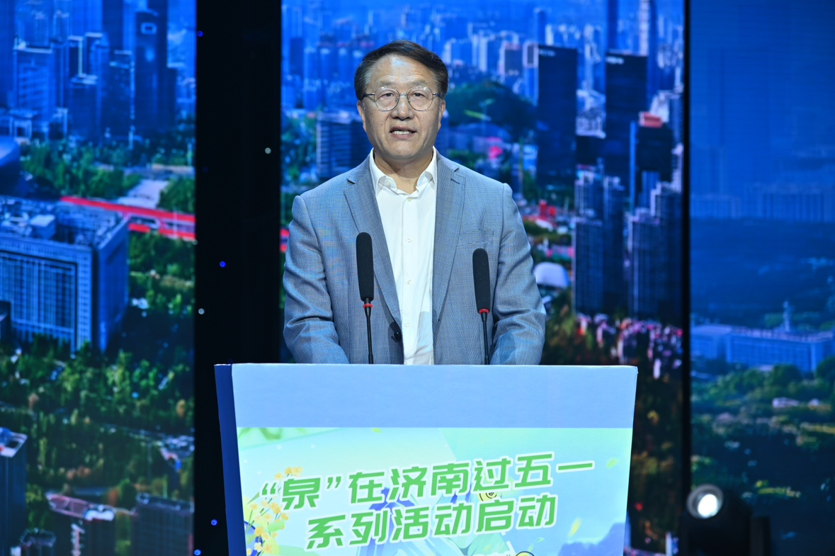 济南市委宣传部副部长、市政府新闻办主任赵民上台致辞。他对系列活动的启动表示赞许,向活动获奖者致以祝贺,高度赞扬了济南深厚的文化底蕴,肯定了山东师大做出的突出贡献,同时,他宣布了五一文旅活动计划,鼓励青年学生积极参与城市文化推广,为塑造和传播济南城市形象贡献青春力量。