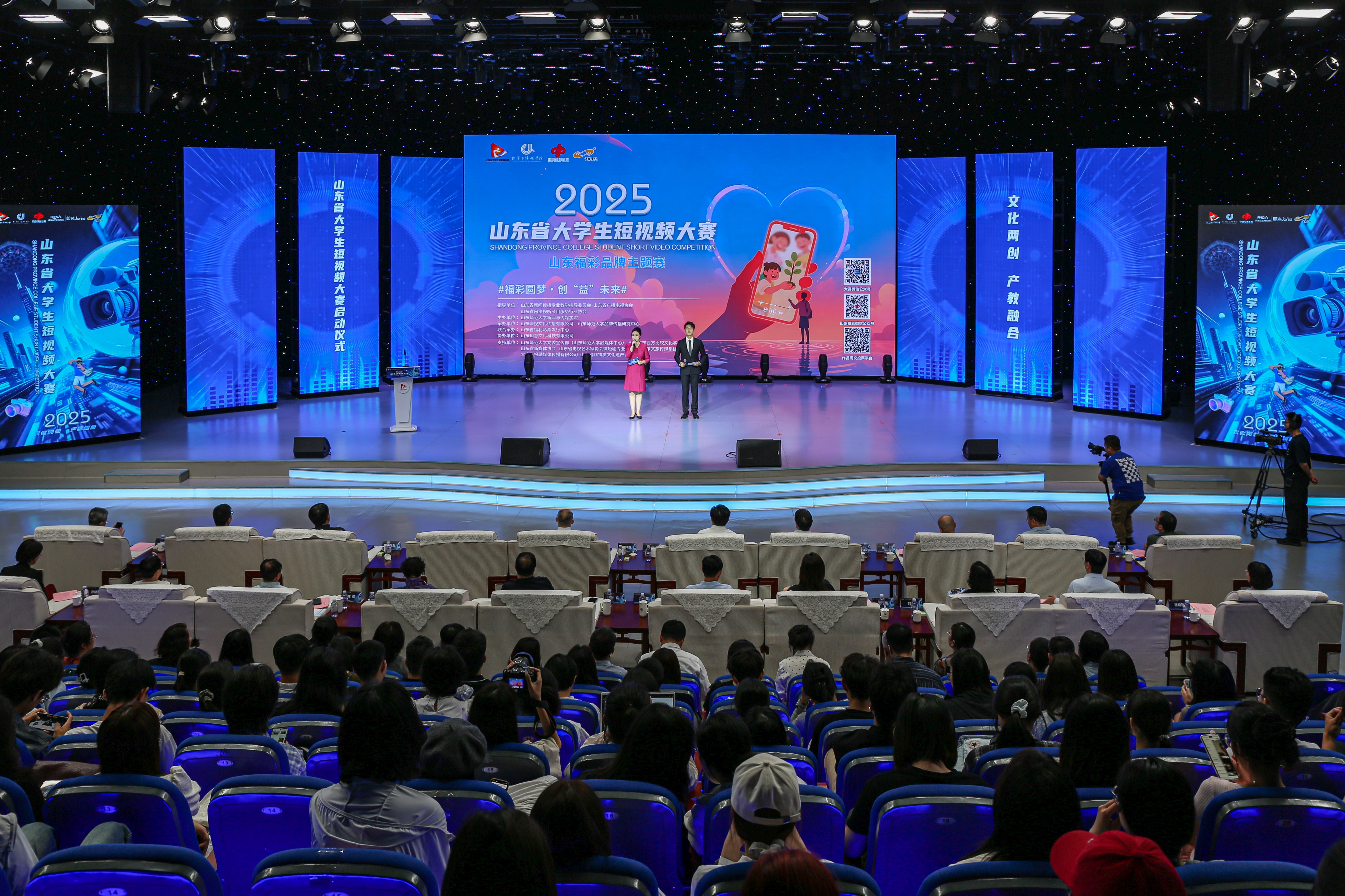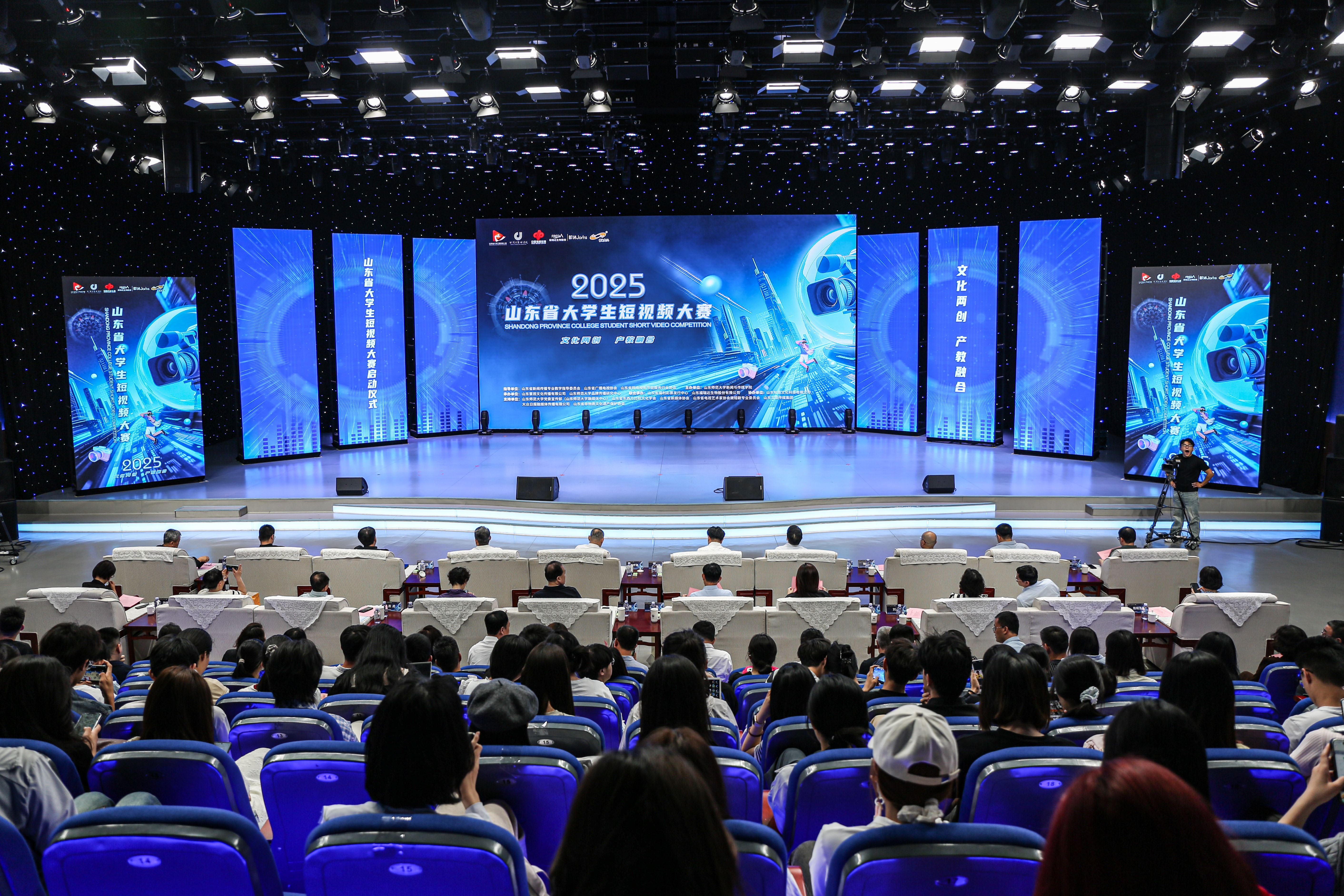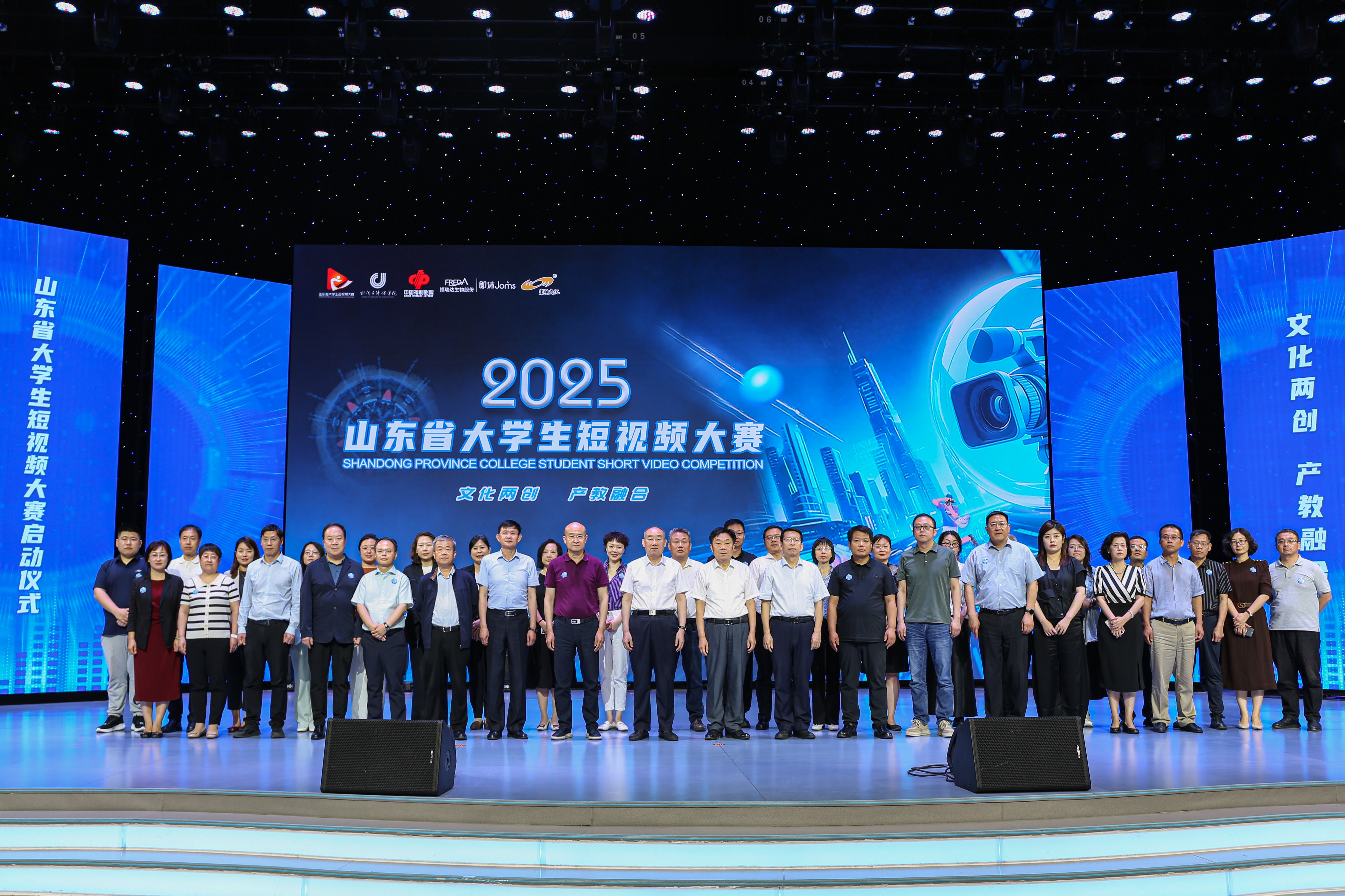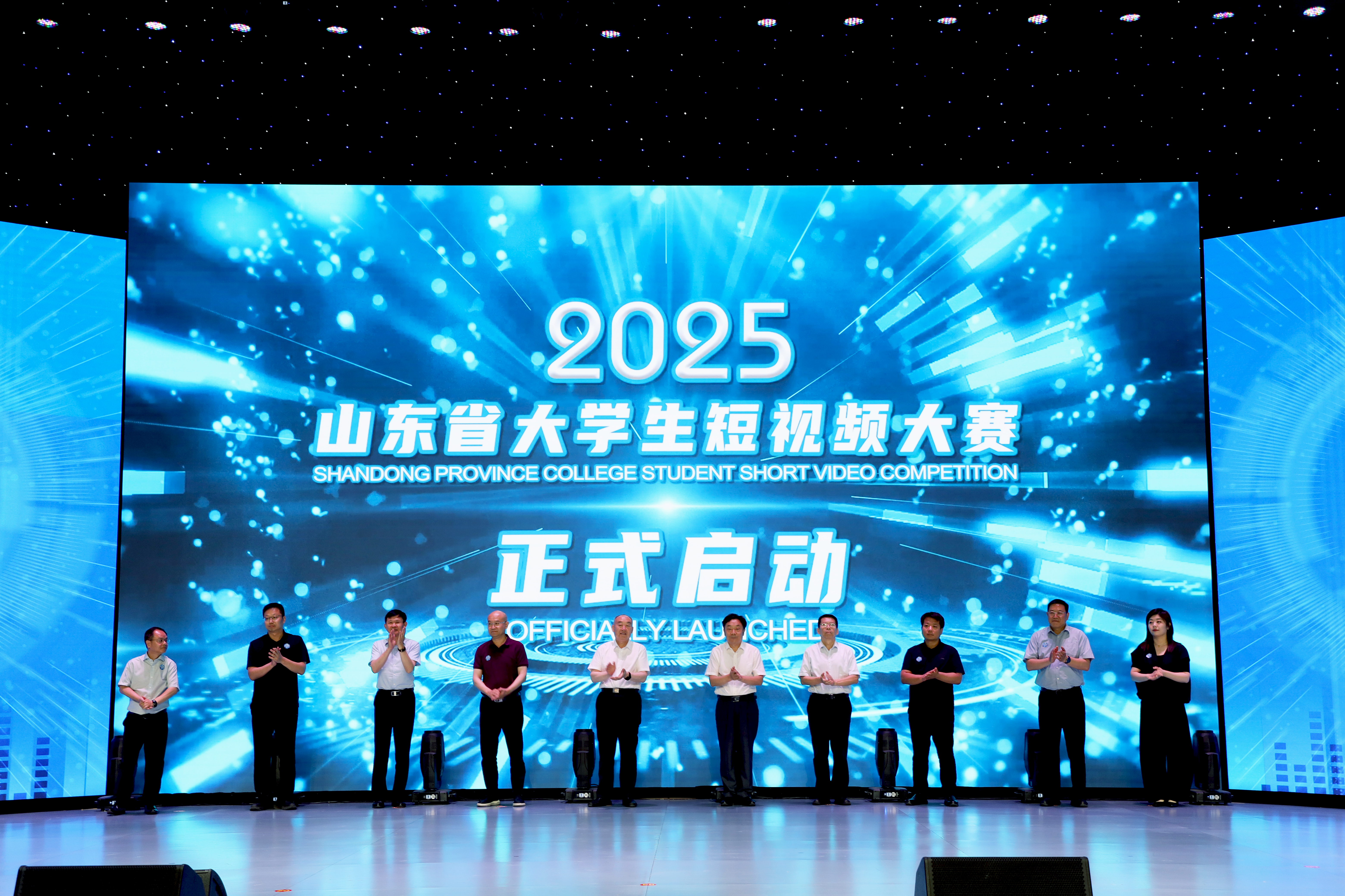 随着倒计时“5、4、3、2、1”响起,启动仪式进入高潮环节。十位来自行业协会、高校及企业的嘉宾共同按下大屏手印,光影交织间,“2025山东省大学生短视频大赛”正式启航!这一刻,不仅是赛事的开启,更是青春力量与文化使命的深情共鸣。
