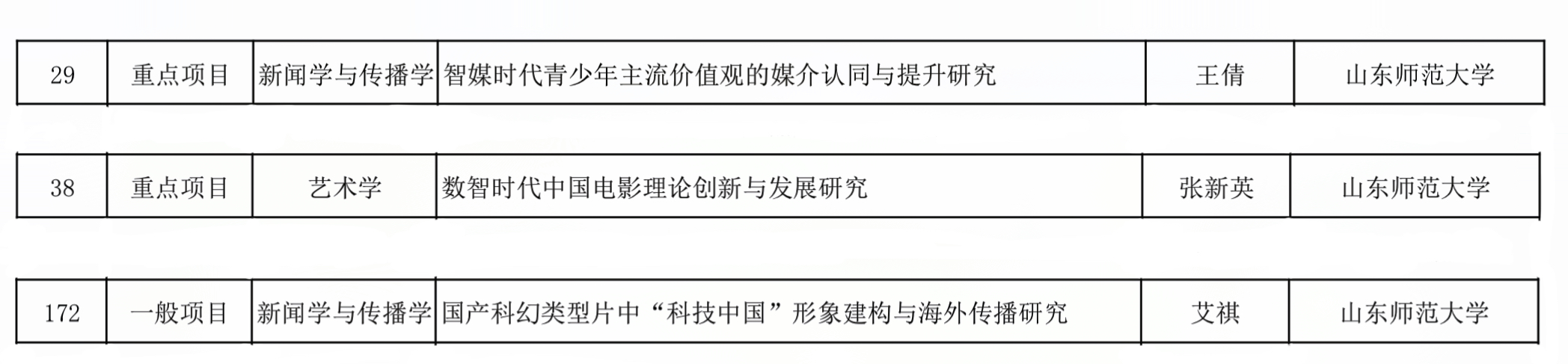 近日,2025年度山东省社会科学规划研究项目拟立项名单正式公布,我院在本次项目申报中共有3个项目成功立项。王倩主持的《智媒时代青少年主流价值观的媒介认同与提升研究》、张新英主持的《数智时代中国电影理论创新与发展研究》获批重点项目;艾祺主持的《国产科幻类型片中“科技中国”形象建构与海外传播研究》获批一般项目。