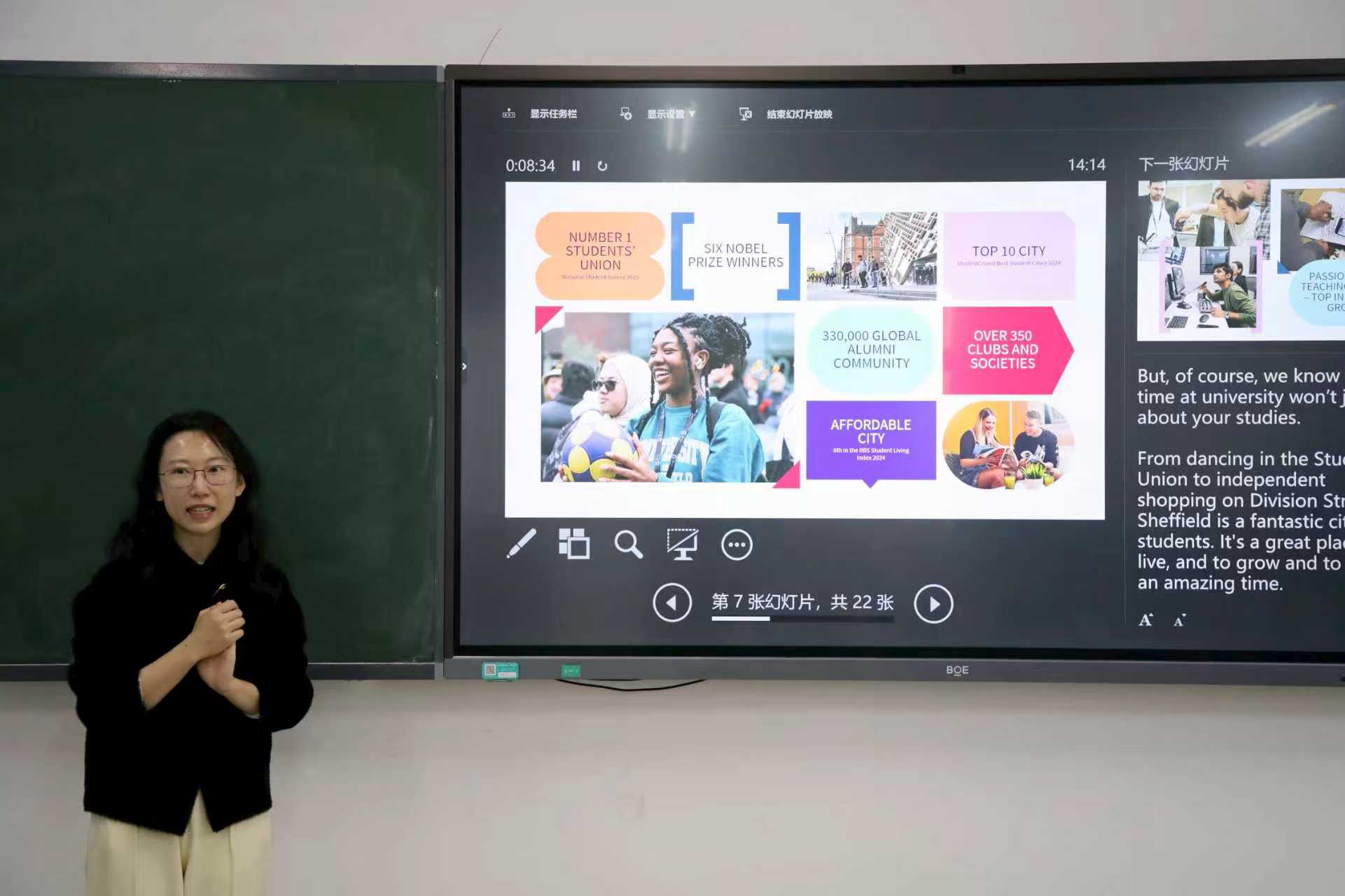 Clarie Guo首先系统介绍了谢菲尔德大学的历史、学术声誉及其教研能力。她特别指出,谢菲尔德大学不仅是罗素大学集团的创始成员之一,其信息、新闻与传播学院在最新的学科评估中亦位列全球前沿,享有极高的国际知名度。该学院拥有来自业界的资深学者和众多活跃于研究一线的顶尖师资,其课程设置紧密融合了理论深度与前沿实践,为学生提供了包括全球新闻学、数字文化与传播、数字媒体与社会等在内的多元化、高水平课程选择。本环节的介绍为同学们评估与规划未来的海外学习路径提供了关键参考依据。