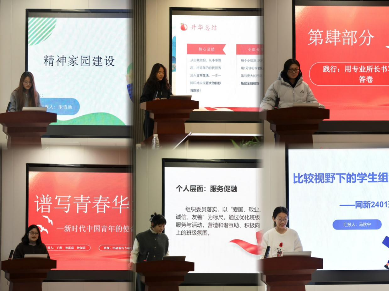 学生干部代表进行专题汇报展示学习成果。25级广电班研究生聚焦新媒体正能量传播,以具体班会方案为抓手,助推校园舆论建设;24、25级广电本班结合影视作品《长安的荔枝》开展主题分享,由多环节沉浸式设计实现青年使命认知的价值升华;24级网新本班立足专业优势,明确四大发展方向并配套落实机制。24级新综本班直面全球传播领域的痛点难题,深刻剖析新传青年时代使命。