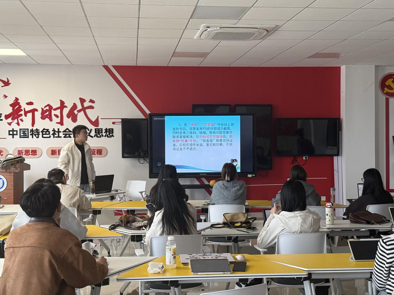 班会首先提醒同学们警惕身边的电信网络诈骗案例,强调每天都有1~3名大学生遭遇电信网络诈骗,其中单人最高金额达到64万元,且不乏借款、贷款。班会随后详细梳理了“虚假平台游戏交易”“企业代付兼职”“垫资做任务”“私下转账购物不发货”“QQ好友借钱”以及“抽奖”等大学生常见的六种诈骗类型,结合长清大学城发生的电信网络诈骗案例——例如“诱导至虚假平台交易游戏账号”“通过支付宝‘企业代付’功能代缴电话费”等典型案例,帮助同学们识别诈骗类型、提高反诈能力。