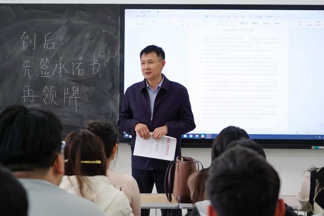动员会上,崔新生为全体工作人员开展了系统而详实的业务培训。结合实践经验,他重点讲解了摄像设备参数调试、不同场景拍摄要点及镜头运用规范,确保录像画面清晰、完整、规范。同时,他对考前准备、现场录制及考后素材整理等环节进行了梳理,并就可能出现的技术问题提出了应对措施,为任务顺利开展提供了有力保障。