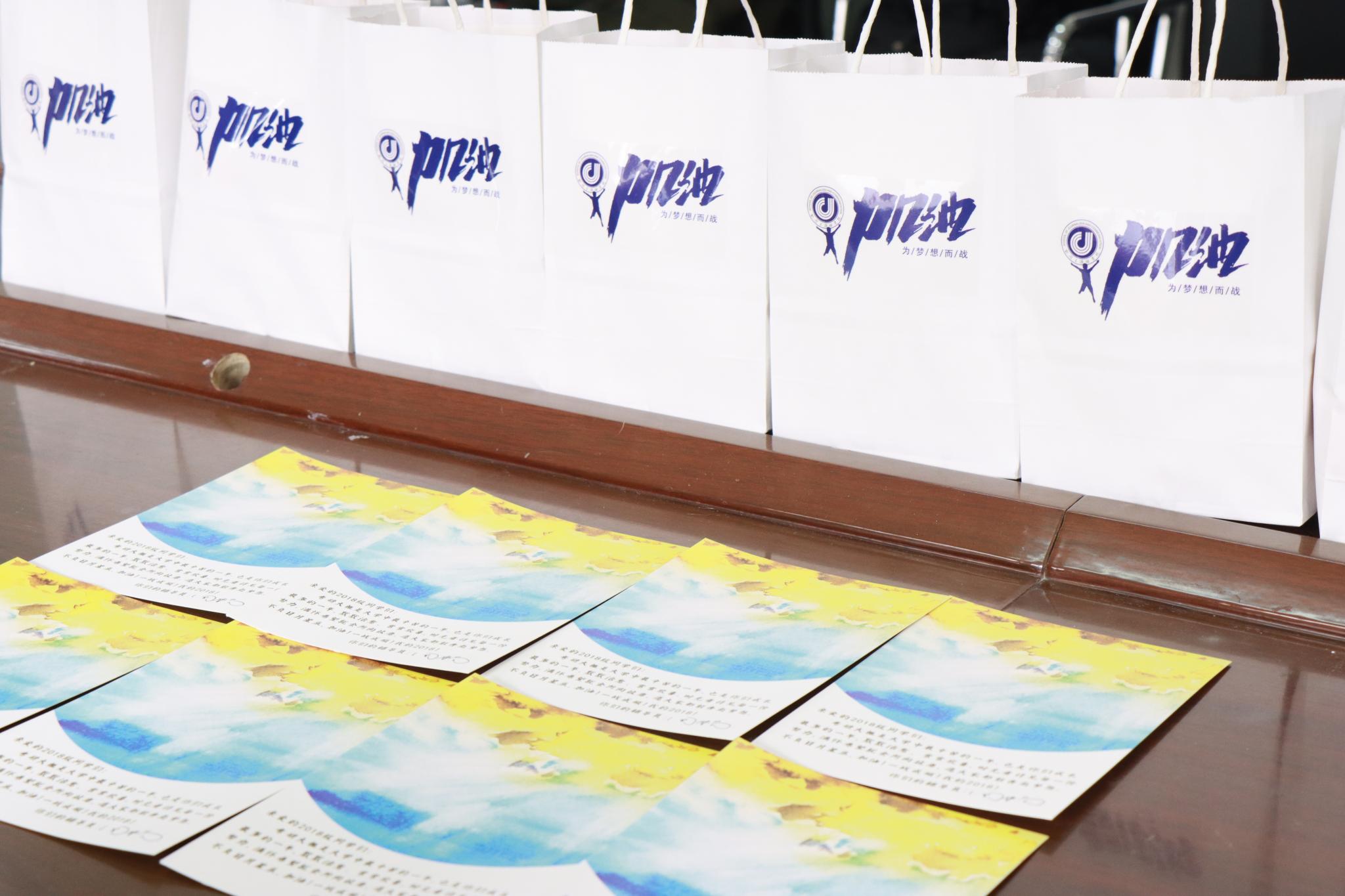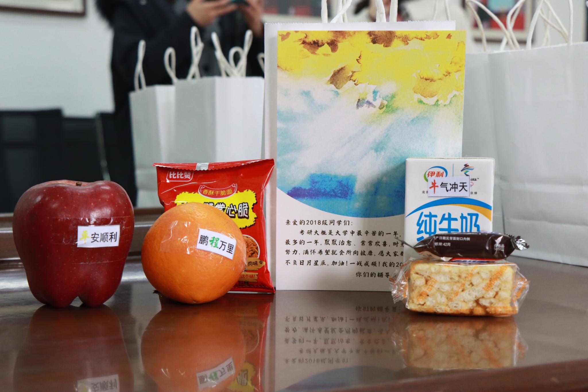“这份礼包拿在手里,感觉沉甸甸的,内容十分丰富!”在现场领取完礼包后,一位同学表示自己通过这“沉甸甸”的重量感受到了学院的殷切关怀。每份礼包中,都有寓意“势不可挡”的士力架、寓意“鹏程万里”的脐橙、寓意“马到成功”的沙琪玛、寓意“平安顺利”的苹果、寓意“出类拔萃”的干脆面、寓意“牛气冲天”的牛奶以及高联考研赞助的文具袋。除了承载着美好期待的零食,礼包中由2018级辅导员周楠精心设计制作的明信片,以文字寄语的形式表达了老师对考研同学的理解、关怀与支持。