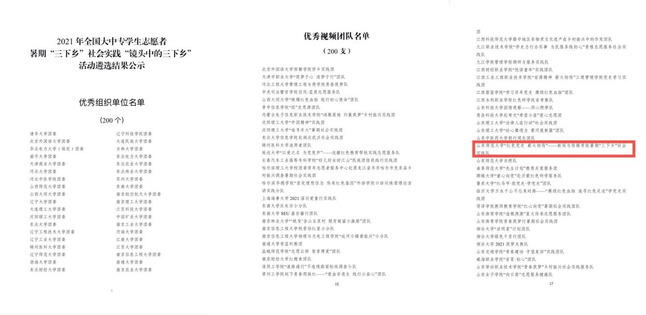 近日,学院“红色党史,薪火相传”暑期“三下乡”社会实践队喜报频传。荣获团中央2021年全国大中专学生志愿者暑期“三下乡”社会实践“镜头中的三下乡”优秀视频团队,教师赵薛娇获评优秀指导老师,2019级新闻学本科生王烨烜获评优秀通讯员;获得团省委2021年“学党史 强信念 跟党走”全国青少年红色文化传承展示活动大学生红色寻访“优秀实践团队”。