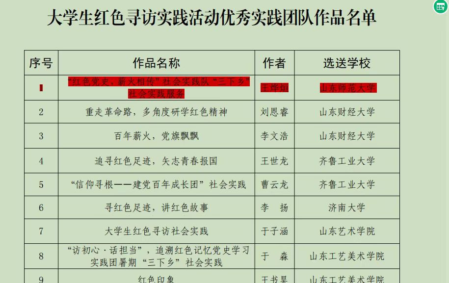 “学党史 强信念 跟党走”全国青少年红色文化传承展示社会实践活动是由共青团山东省委、省教育厅、省学联、省少工委共同举办,通过线上作品收集、专家评选等环节评选出100支优秀实践队伍。