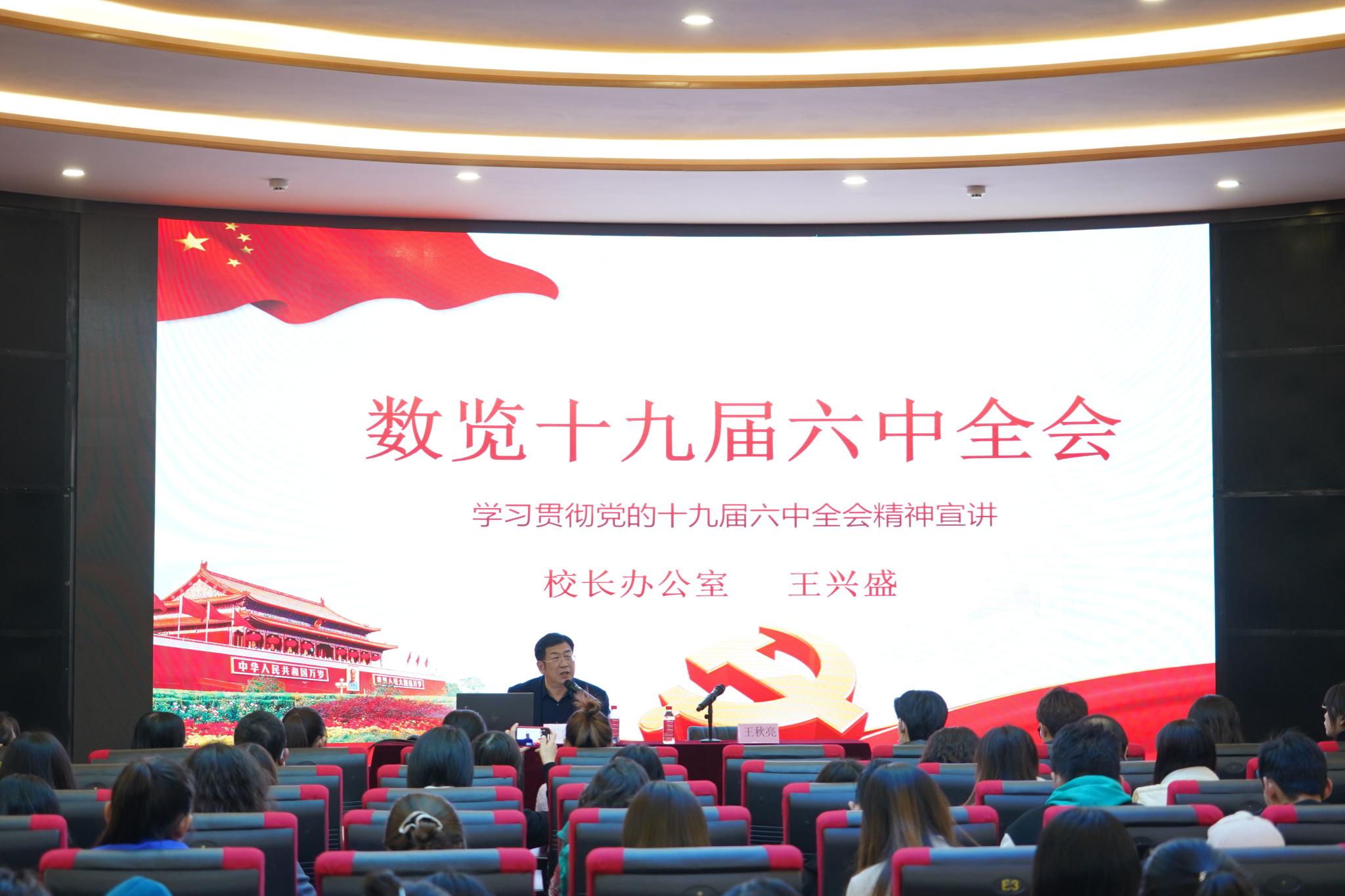 12月9日下午,学院学习贯彻党的十九届六中全会精神宣讲报告会在学校长清湖校区树蕙堂二层报告厅举行。报告会邀请学校宣讲团成员、校长办公室主任王兴盛作《数览十九届六中全会精神》专题辅导。学院班子成员、教工代表、学生代表200余人聆听报告。报告会由学院党委书记王秋亮主持。