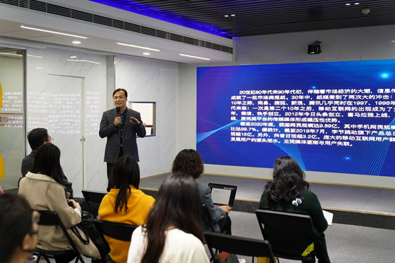 魏传强作专题讲座,讲座以“从智媒矩阵到中台战略”为主题,以“齐鲁晚报·齐鲁壹点的融合发展实践与探索”为主线,结合媒体融合发展的背景、齐鲁晚报•齐鲁壹点智媒矩阵和中台战略,向老师同学们介绍了齐鲁晚报·齐鲁壹点的融合发展目标和路径。魏传强认为媒体融合发展是党的事业和国家战略要求,也是媒体生态格局变化要求;他讲到,齐鲁晚报·齐鲁壹点以打造“新型现代智慧传媒”为定位,实施齐鲁晚报·齐鲁壹点双品牌战略,做强智媒、智云、智库三大平台,做优“传媒+N”业态模式,构建起融媒体的全新影响力,并详细阐述了智媒、智云、智库三大平台的具体应用;他具体介绍了内容、数据、技术三大中台的内涵和应用,指出齐鲁晚报•齐鲁壹点中台战略走在了全国主流媒体融合发展的前列。随后,他与新闻系学子们从智能化内容生产、用户运营服务、主流价值观与智能算法的关系等话题进行了探讨。