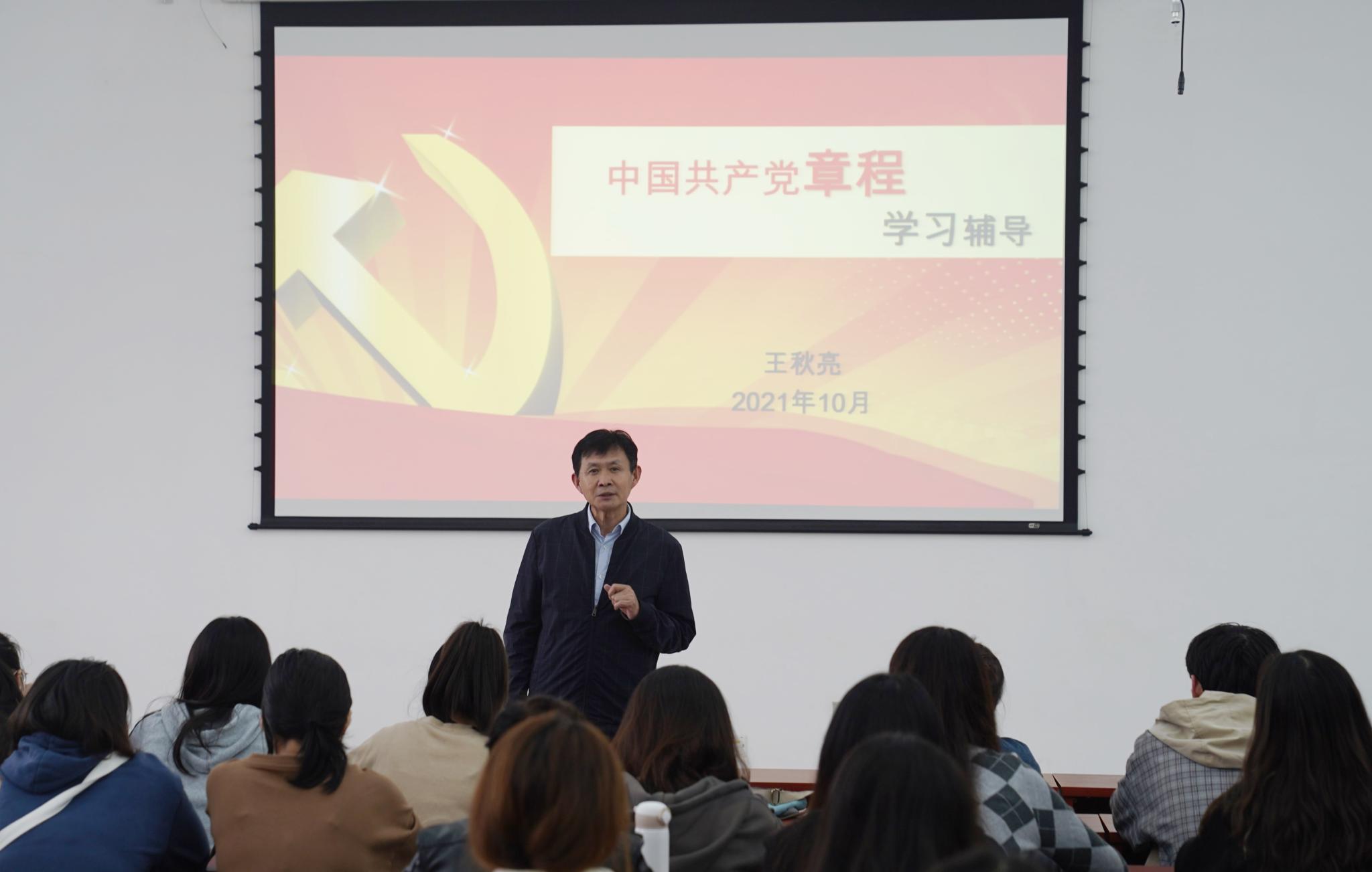 王秋亮从十九大对《中国共产党章程》修改的主要内容入手,从十个方面深入阐释了《中国共产党章程》修改的时代背景、重要意义;围绕“八个明确,十四个坚持”深刻解读了习近平新时代中国特色社会主义思想的具体内涵;对党的性质、党的主要成就和历史任务、社会主义初级阶段党的基本路线和任务、党的建设等重点内容进行了讲解;从党员的条件、权利义务和纪律要求、党和共产主义青年团之间的关系、党徽党旗等党章的条文进行了学习辅导。希望同学们把握时代机遇,围绕国家和社会的发展对青年人才提出的要求,端正学习态度,学好党的路线方针政策,提高自身的学习能力和综合素养,为国家富强和社会发展贡献自己的聪明才智。