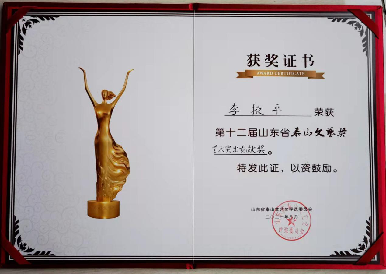 山东省“泰山文艺奖”是2007年11月经中共山东省委、山东省人民政府批准设立的全省文艺界的综合性文艺大奖,是山东省文艺界最高奖,代表了山东省文艺界的最高荣誉,参评作品涉及戏剧、音乐、曲艺、舞蹈、杂技、美术、书法、摄影、电影、电视、民间文艺等11个门类。李掖平捧得该奖项的最重要奖项,对我院艺术类学科的建设和学院的高质量内核式发展具有重大意义。