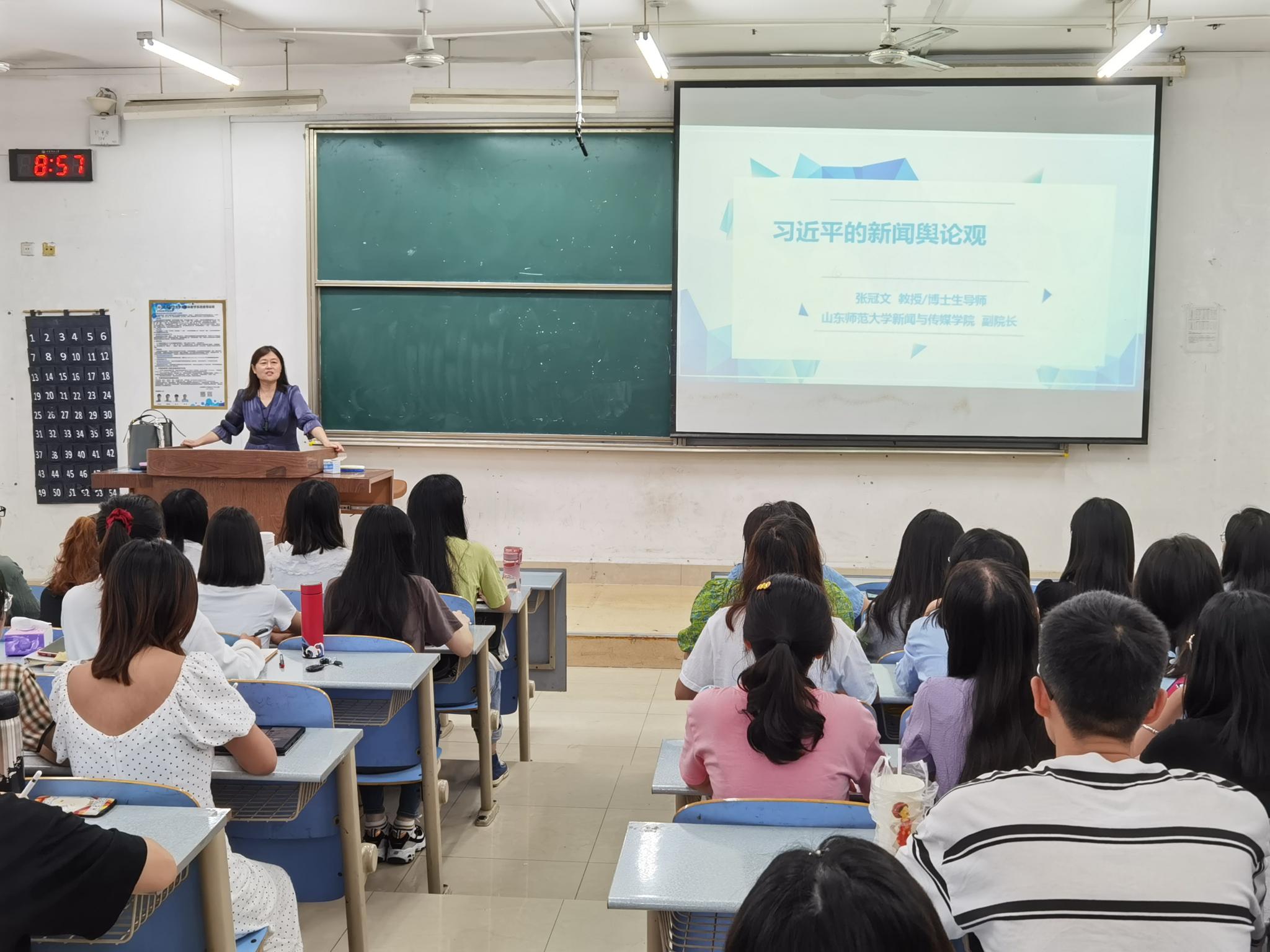 张冠文以“习近平的新闻舆论观——智媒时代舆情危机的应对策略”为题,结合智能媒体背景下的社会现象分析当下舆情的发展趋势,用前沿的目光和见解提醒同学们要趋利避害,辩证看待人工智能为科技带来的福音,警惕智媒时代下缺失温度的新闻报道和公式化的写作模式。